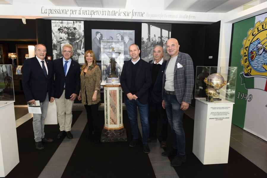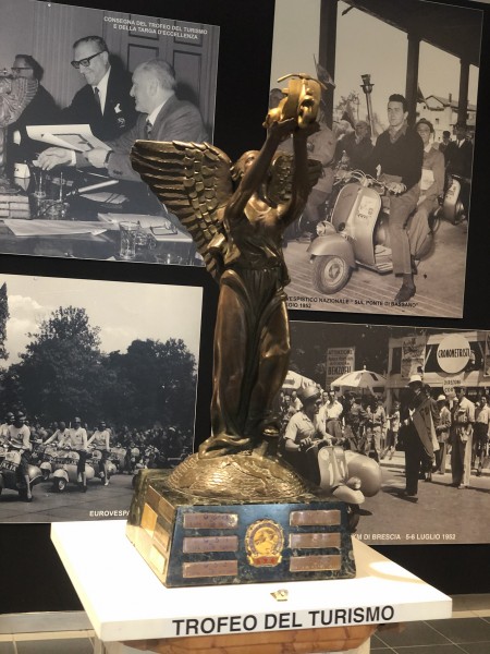 Così, insieme ai gonfaloni storici di rappresentanza quali orgoglio di appartenenza, troviamo i rari trofei dei raduni, delle attività sportive e turistiche: uno fra tutti il leggendario Trofeo del Turismo, pezzo unico, assegnato annualmente dal 1950 al ‘69 al Vespa Club che nel corso dell’annata aveva svolto la maggiore attività turistica. Veniva consegnato temporaneamente per la durata di un anno e doveva essere restituito al Vespa Club d’Italia un mese prima del Congresso ordinario. All’atto della restituzione il Trofeo veniva sostituito con un esemplare ridotto che veniva conservato definitivamente nella sede del Vespa Club premiato.
