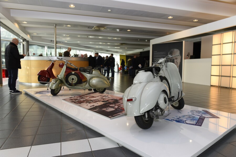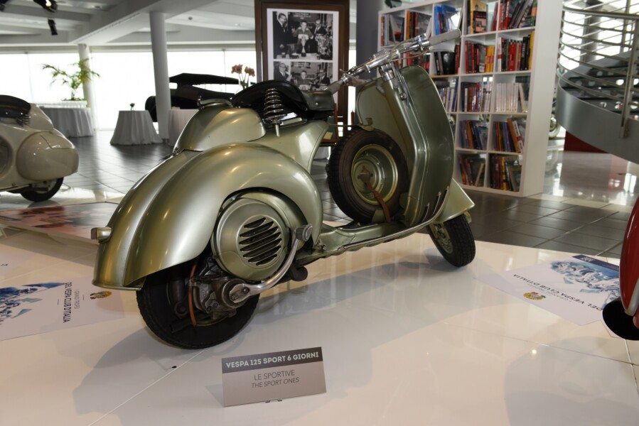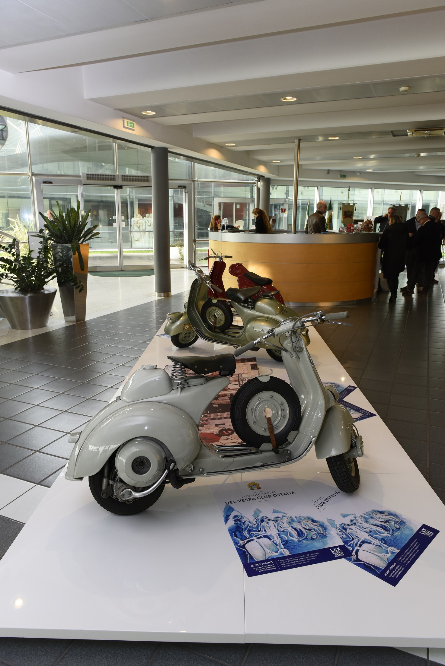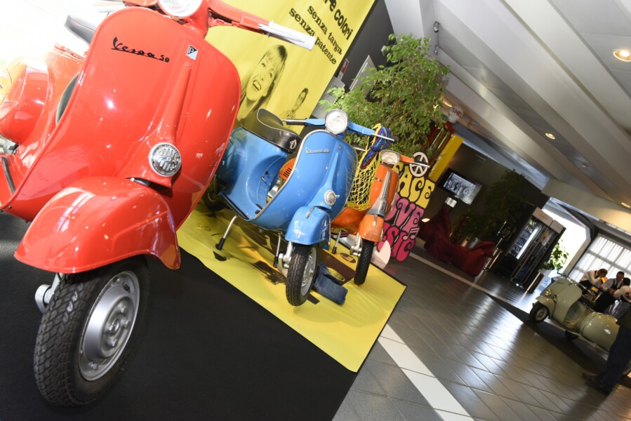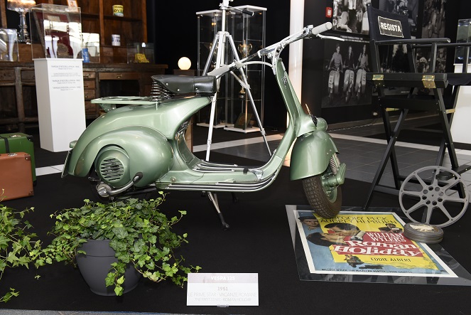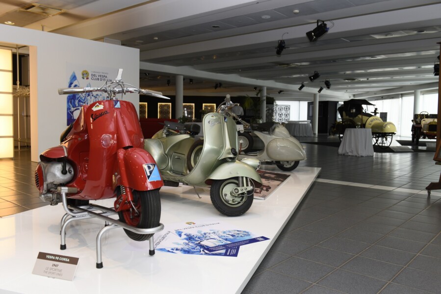 Naturalmente, i complementi fondamentali che aggregano questa storia inarrivabile negli anni in cui si è manifestata, saranno gli scooter Vespa che hanno avuto maggior rilievo nella società e nel cuore degli appassionati: la Vespa 98 del 1946 l’inizio della fantastica avventura che ricorda Enrico Piaggio e Corradino D’Ascanio, le Sport “6 giorni” del 1952 e del 1953 delle memorabili imprese sportive, la 125 del 1952 modello interprete del film di William Wyler “Vacanze Romane” con Audrey Hepburn e Gregory Peck, e tanti altri memorabili pezzi che rappresentano un percorso entusiasmante sino agli anni ’70. Vale la pena di ricordare l’accostamento di questo magico veicolo al mondo femminile negli anni ‘50 con l’Audax internazionale femminile, l’epico raduno di Milano e il raduno internazionale ”Ragazze in Vespa”.