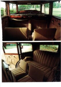 I comodi interni dell’Ansaldo Tipo 22 e, qui sopra, la pelle originale e perfettamente conservata del sedile di guida. L’oggetto che vediamo in alto è un accendisigaro in dotazione della vettura che porta il marchio con i due cannoni: incrociati: l’azienda originaria, infatti, produceva artiglierie.