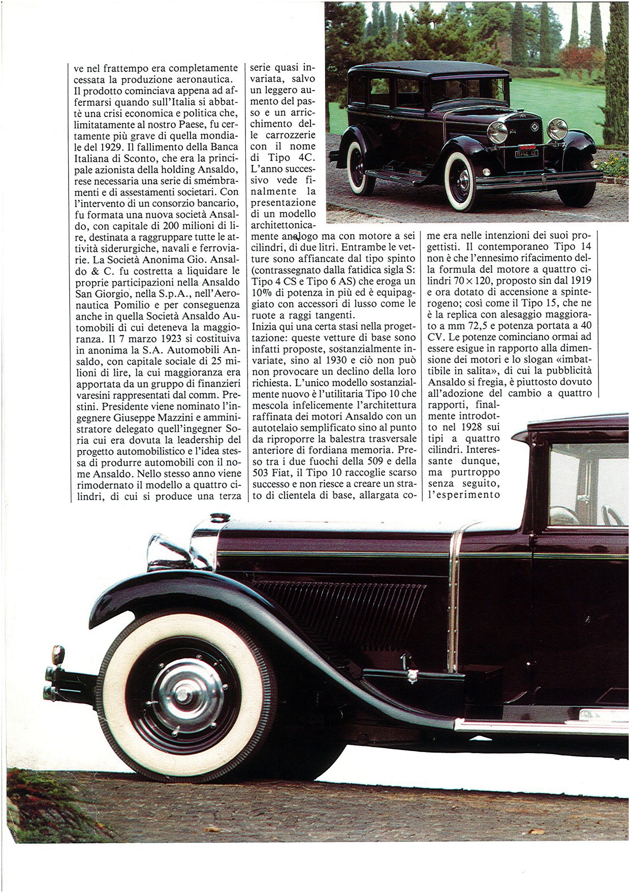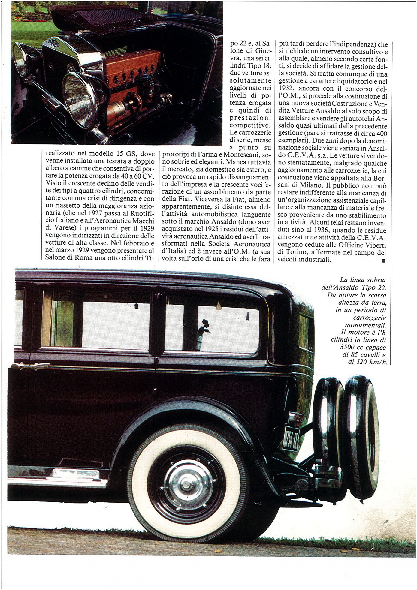 L’Ansaldo otto cilindri Tipo 22 è il culmine della gamma di questa marca, ma è anche il suo canto del cigno: un prodotto che Guido Soria — il virtuale fondatore dell’impresa automobilistica Ansaldo — non avrebbe certamente voluto. Ma Soria (com’egli stesso lascia intendere in un documento, recentemente venuto in luce al Museo Biscaretti) era stato costretto alle dimissioni un anno prima che questi insensati investimenti venissero deliberati. Rara e preziosa, l’Ansaldo Tipo 22 resta come uno dei simboli della traumatica fine delle illusioni coltivate da molta parte dell’industria italiana sul declinare degli anni Venti. La S.A. Automobili Ansaldo nasce dello smembramento e dalle esigenze di conversione postbellica di una delle più grandi e più antiche holding dell’industria meccanica italiana. Esistevano dunque tutte le premesse tecniche e le risorse economiche perché l’impresa potesse affermarsi in modo durevole. Viceversa questa, che è ritenuta anche dagli esigenti storici inglesi una delle più illustri marche scomparse, subì un primo tracollo già nel 1922 e fu in piena attività solo per un decennio. Se l’Ansaldo non sopravvisse alla crisi mondiale del 1929, ciò si deve — come per molte altre imprese che ebbero vicende analoghe — a un errore di marketing, all’incapacità di esprimere il prodotto giusto per sopravvivere alla decimazione delle marche italiane. Sulla crisi del 1929 si sono scritte molte banalità. Noi vogliamo sostenere che essa fu (almeno per il settore dell’industria automobilistica italiana) non solo una congiuntura negativa in termini di disponibilità di credito e di volume del fatturato, ma una vera e propria crisi di trasformazione dei procedimenti produttivi, che coincise con la trasformazione del ruolo sociale dell’automobile. Una crisi sostenibile solo con precise scelte di ruolo, appunto, e ricorrendo alla differenziazione del prodotto. Che poi questa crisi organica coincidesse con una depressione economica mondiale è, in una certa misura, casuale. La spiegazione più semplice della scomparsa di molte aziende non può essere che una, in un mercato progressivamente sempre più soffocato dalla difficoltà di esportare e da una certa carenza di materie prime: in Italia non vi era posto che per una Fiat, un’Alfa Romeo, una Lancia.