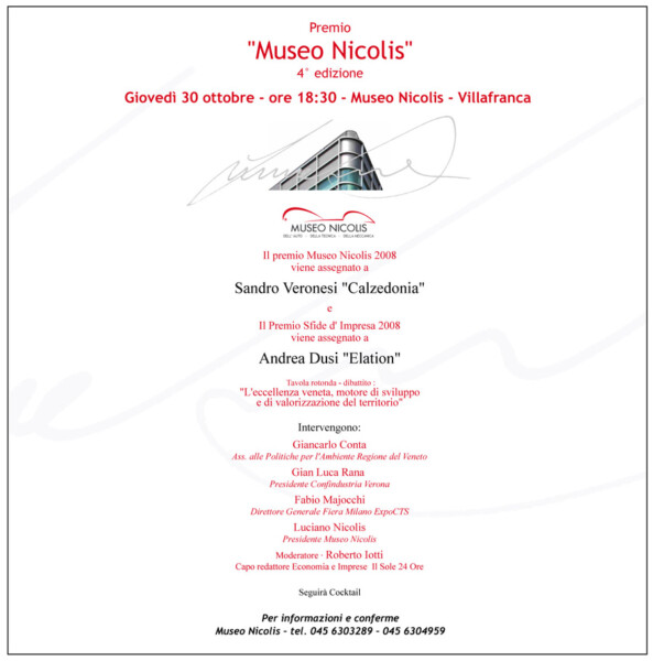 COMUNICATO STAMPA – Il Premio “Museo Nicolis 2008” a Sandro Veronesi. Assegnato per la prima volta il premio “Sfide d’Impresa” all’idea innovativa di Elation.