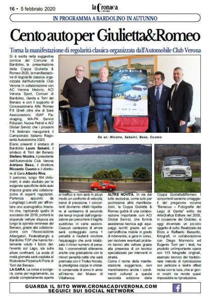 Le verifiche sportive e tecniche si terranno al Museo Nicolis dalle 8 alle 9 di sabato, mentre la partenza sarà ospitata nel Castello di Villafranca, dalle 9.45. La prima parte dell’itinerario guiderà i concorrenti verso il Lago di Garda, passando per le pendici del Monte Baldo prima di scendere a Torri del Benaco. Gran finale al Museo Nicolis con la cerimonia di premiazione. La manifestazione consisterà in due eventi in uno. La gara di Regolarità Classica sarà composta da 49 pressostati che assegneranno la Coppa Giulietta e Romeo. I concorrenti della gara classica competeranno poi su successive 20 prove cronometrate nella seconda parte della giornata che assegneranno il Trofeo Luciano Nicolis. Seconda tipologia di evento sarà il raduno Ruote nella Storia Memorial Cabianca sullo scenografico percorso fino a Torri del Benaco e i cui partecipanti potranno affrontare, facoltativamente, anche 49 prove cronometrate. Il mito degli innamorati shakespeariani tornerà in versione quattro ruote anche nel 2020: Paolo Tosi, presidente di Aci Verona Historic, ha infatti ricordato che «una manifestazione molto importante si terrà sabato 8 febbraio con un’altra Coppa Giulietta e Romeo, valida per il campionato italiano auto storiche che si snoderà fra la città e le strade del lago». L’assessore Luca Zamperini ha sottolineato che «nel castello è apposta una targa con un passo di Shakespeare su Giulietta e Romeo, un tributo culturale che ben si abbina alla storia che la gara di sabato richiama nel suo nome». Danilo Castellarin, fonte giornale L'Arena 21 novembre 2019