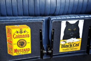 "L'anima del commercio". Pubblicità di senape e sigarette su targhe metalliche fissate sotto il cuscino degli strapuntini. Se questi sono liberi, le targhe sono ben visibili dagli altri passeggeri.
