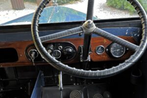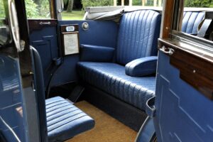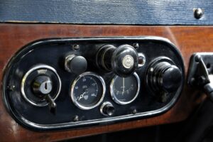 "Quadro raccolto". Nel pannello centrale si trovano tutti i comandi elettrici, compreso il pulsante d’avviamento, oltre al manometro dell’olio e all’amperometro. Sotto a sinistra. Molto accogliente e dotato di bracciolo estraibile il divano posteriore. Stando al regolamento di Scotland Yard, era vietato imbottirlo con ossi di balena macinati..