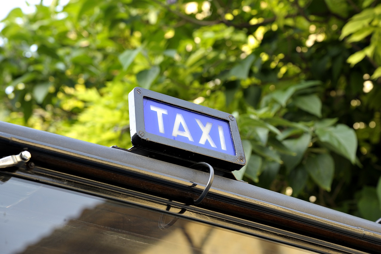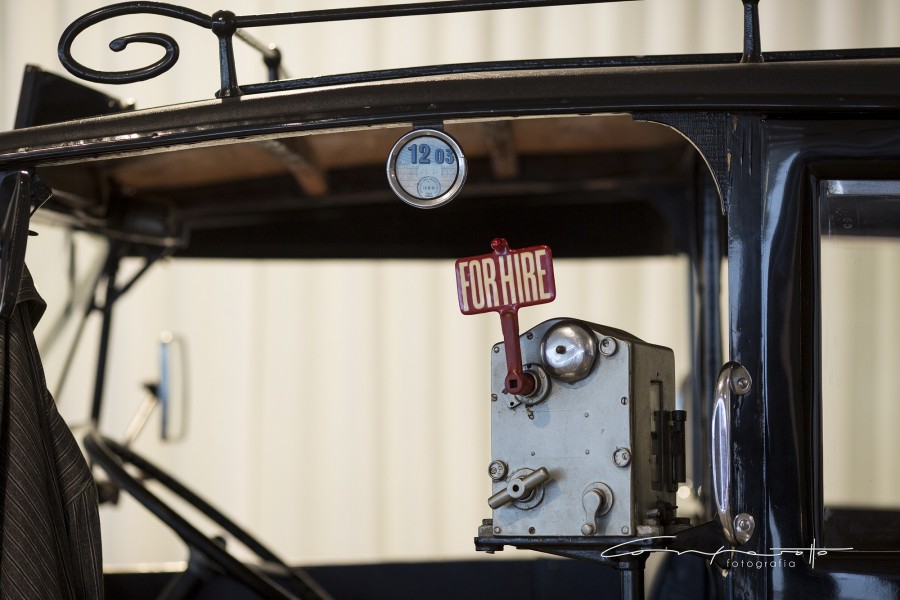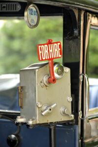 "Il tempo è denaro". Il tassametro con la paletta che indica se la vettura è libera (“For hire”). È orientato in modo che il costo sia visibile dai passeggeri.
