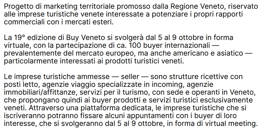 Le imprese turistiche ammesse sono strutture ricettive con posti letto, agenzie viaggio specializzate in incoming, agenzie immobiliari/affittanze, servizi per il turismo, con sede e operanti in Veneto: prodotti e servizi turistici proposti ai buyer devono essere esclusivamente veneti e a numero chiuso.