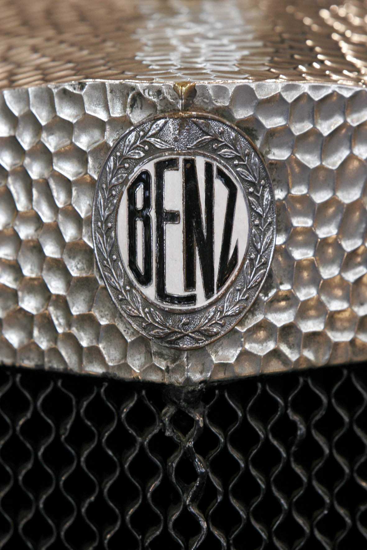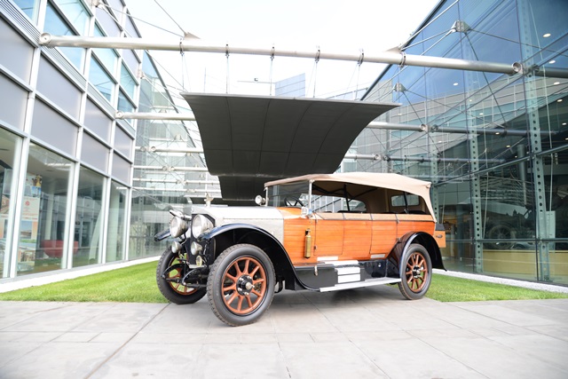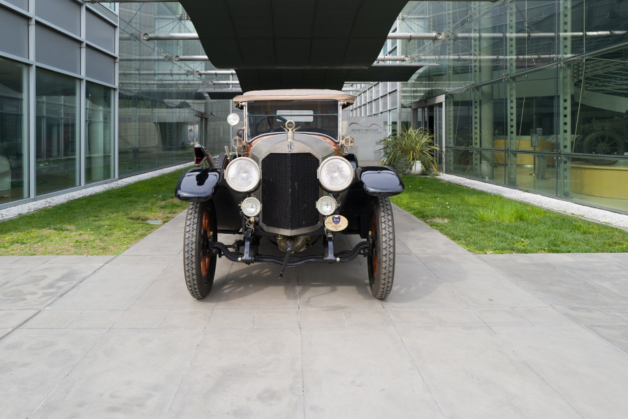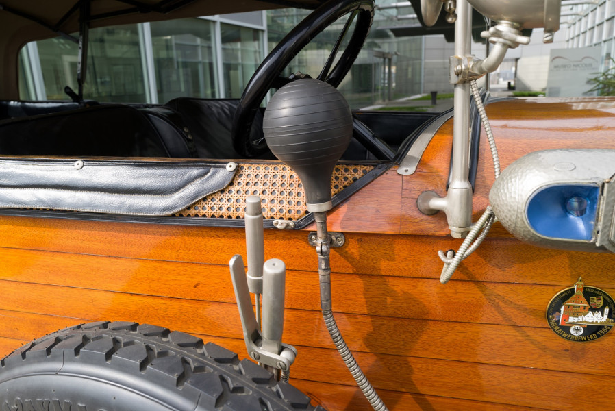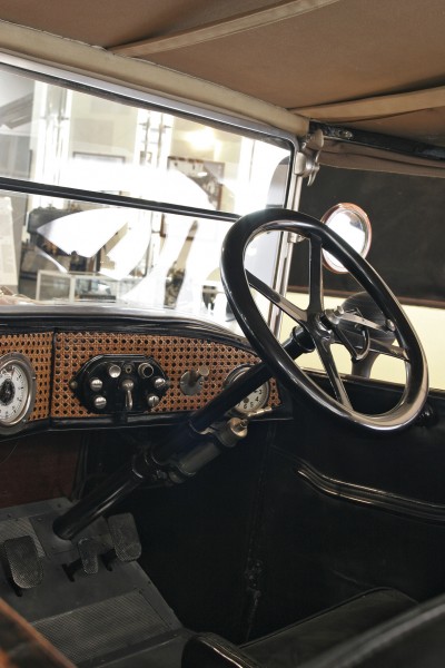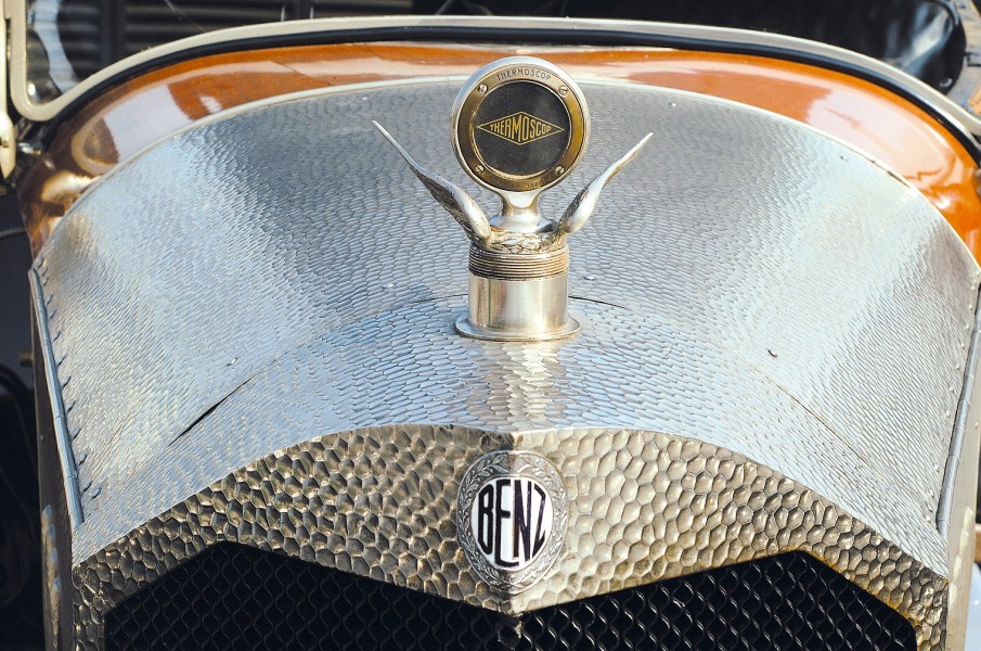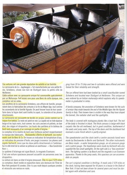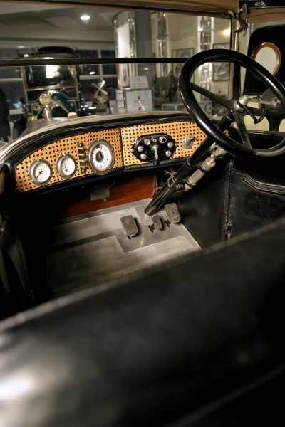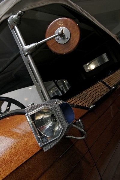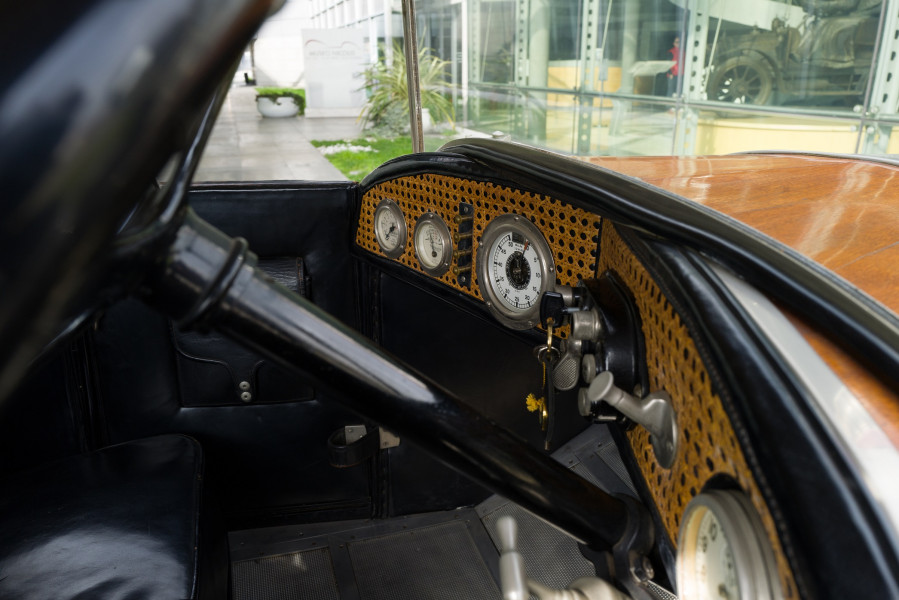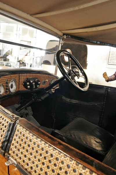 Le più importanti Case Automobilistiche, ad inizio secolo, avevano a listino vetture da corsa accanto a vetture da turismo o rappresentanza. La Benz oltre alle vetture da corsa di 15.000 e 21.500cc e a quelle imponenti di rappresentanza con cilindrata anche oltre gli 8.000cc, produsse, negli anni immediatamente precedenti lo scoppio della guerra, la 8/20 PS, una tranquilla e affidabile vettura da turismo. La vettura esposta è molto prestigiosa e fu ordinata da un maharaja indiano, ciò spiega perché la velocità oraria è indicata in miglia. La particolare e unica carrozzeria è firmata da Schebera, situata a Heilbronn, non lontano da Stoccarda. Gli Schebera, discendevano da una famiglia d’affari, nota nella storia per la costruzione delle armature. La loro esperienza tecnica unisce l’ottone nichelato e lavorato a mano del cofano, del radiatore e dei fanali ai particolari in paglia di Vienna che adornano sia i fianchi della carrozzeria in legno di mogano, sia parte degli interni sia il grande baule esterno. All’interno vi era posto fino a sei persone, grazie anche ai due sedili di emergenza pieghevoli posti davanti all’accogliente divano posteriore. Ricco di strumenti è il cruscotto con indicatore di velocità in miglia; particolare il clacson esterno a forma di serpente boa, aggiunto in epoca successiva.