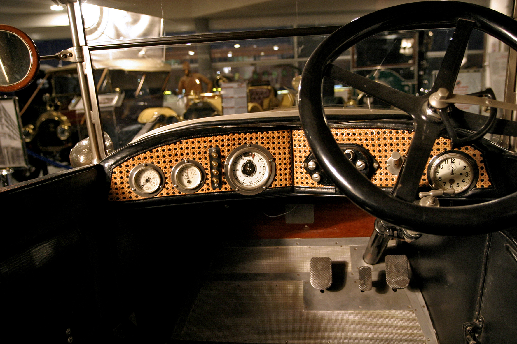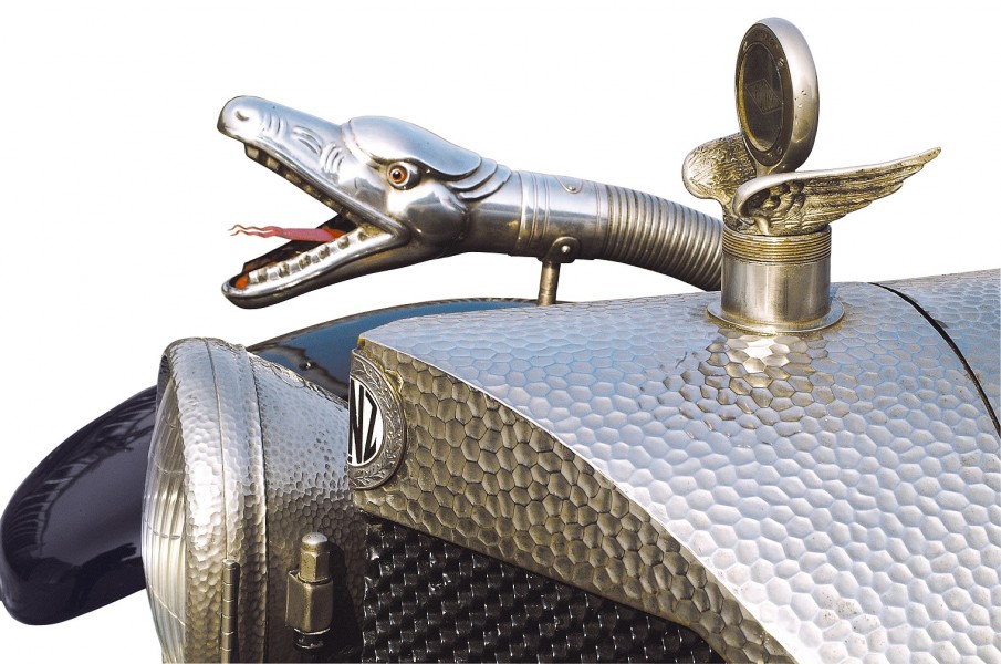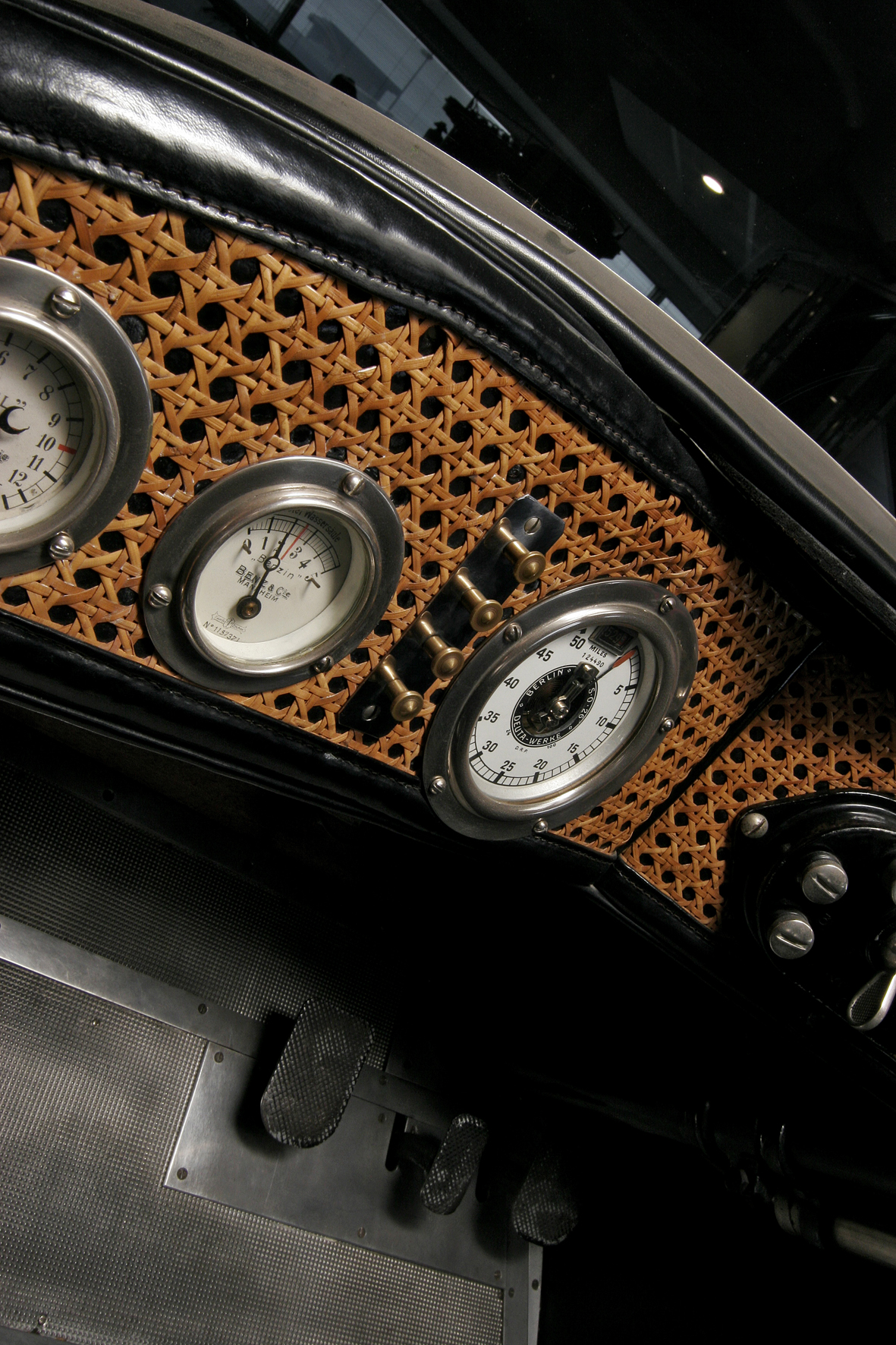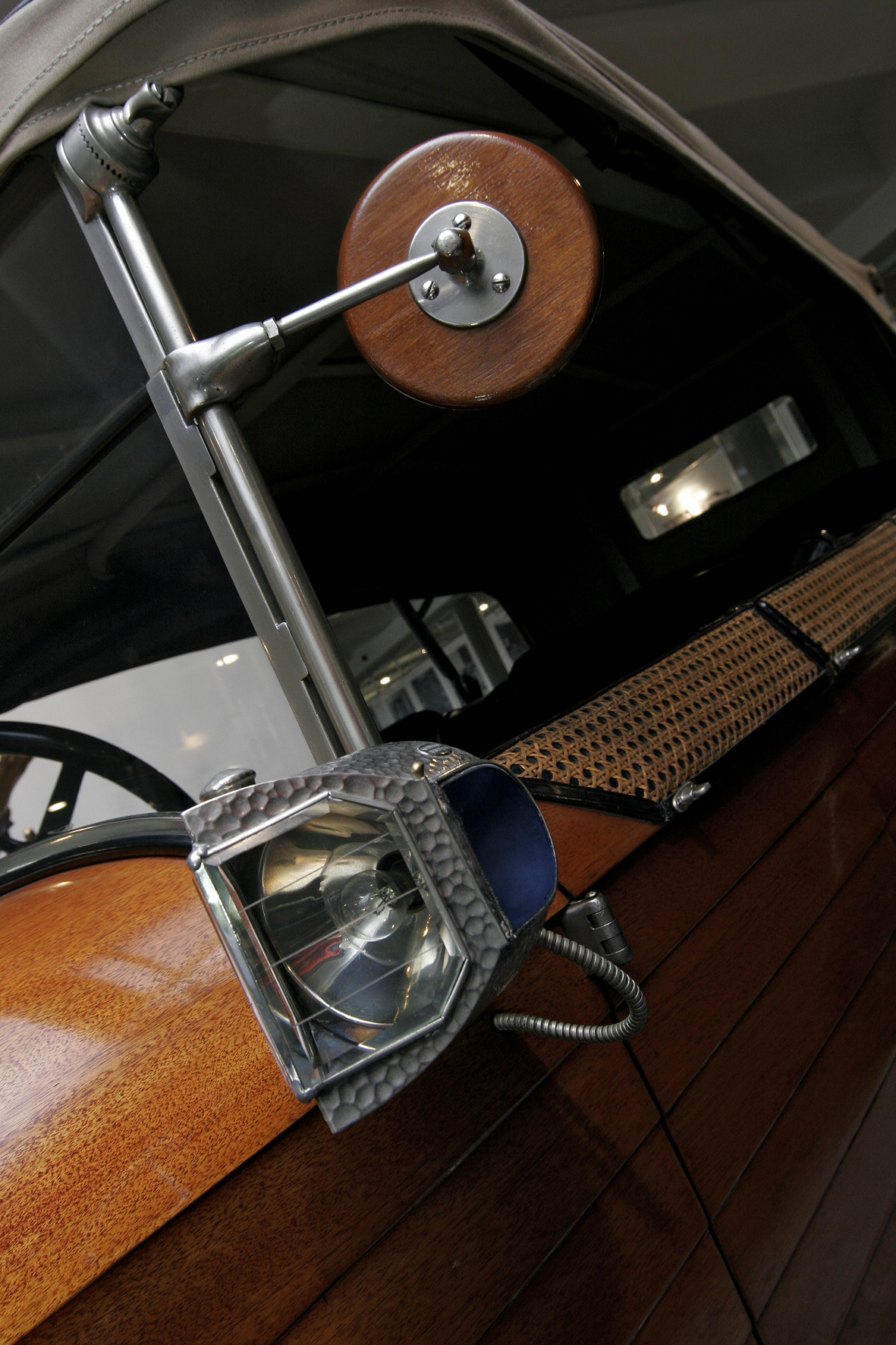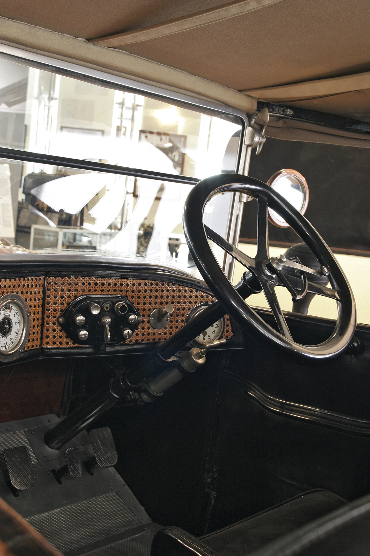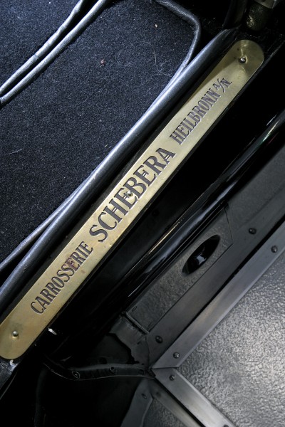 Le più importanti Case Automobilistiche, ad inizio secolo, avevano a listino vetture da corsa accanto a vetture da turismo o rappresentanza. La Benz oltre alle vetture da corsa di 15.000 e 21.500cc e a quelle imponenti di rappresentanza con cilindrata anche oltre gli 8.000cc, produsse, negli anni immediatamente precedenti lo scoppio della guerra, la 8/20 PS, una tranquilla e affidabile vettura da turismo. La vettura esposta è molto prestigiosa e fu ordinata da un maharaja indiano, ciò spiega perché la velocità oraria è indicata in miglia. La particolare e unica carrozzeria è firmata da Schebera, situata a Heilbronn, non lontano da Stoccarda. Gli Schebera, discendevano da una famiglia d’affari, nota nella storia per la costruzione delle armature. La loro esperienza tecnica unisce l’ottone nichelato e lavorato a mano del cofano, del radiatore e dei fanali ai particolari in paglia di Vienna che adornano sia i fianchi della carrozzeria in legno di mogano, sia parte degli interni sia il grande baule esterno. All’interno vi era posto fino a sei persone, grazie anche ai due sedili di emergenza pieghevoli posti davanti all’accogliente divano posteriore. Ricco di strumenti è il cruscotto con indicatore di velocità in miglia; particolare il clacson esterno a forma di serpente boa, aggiunto in epoca successiva.