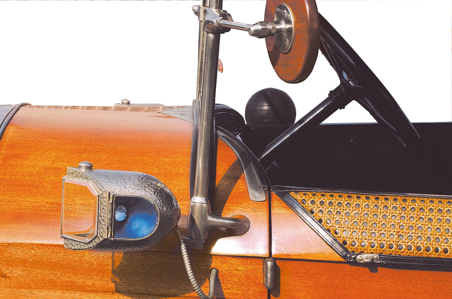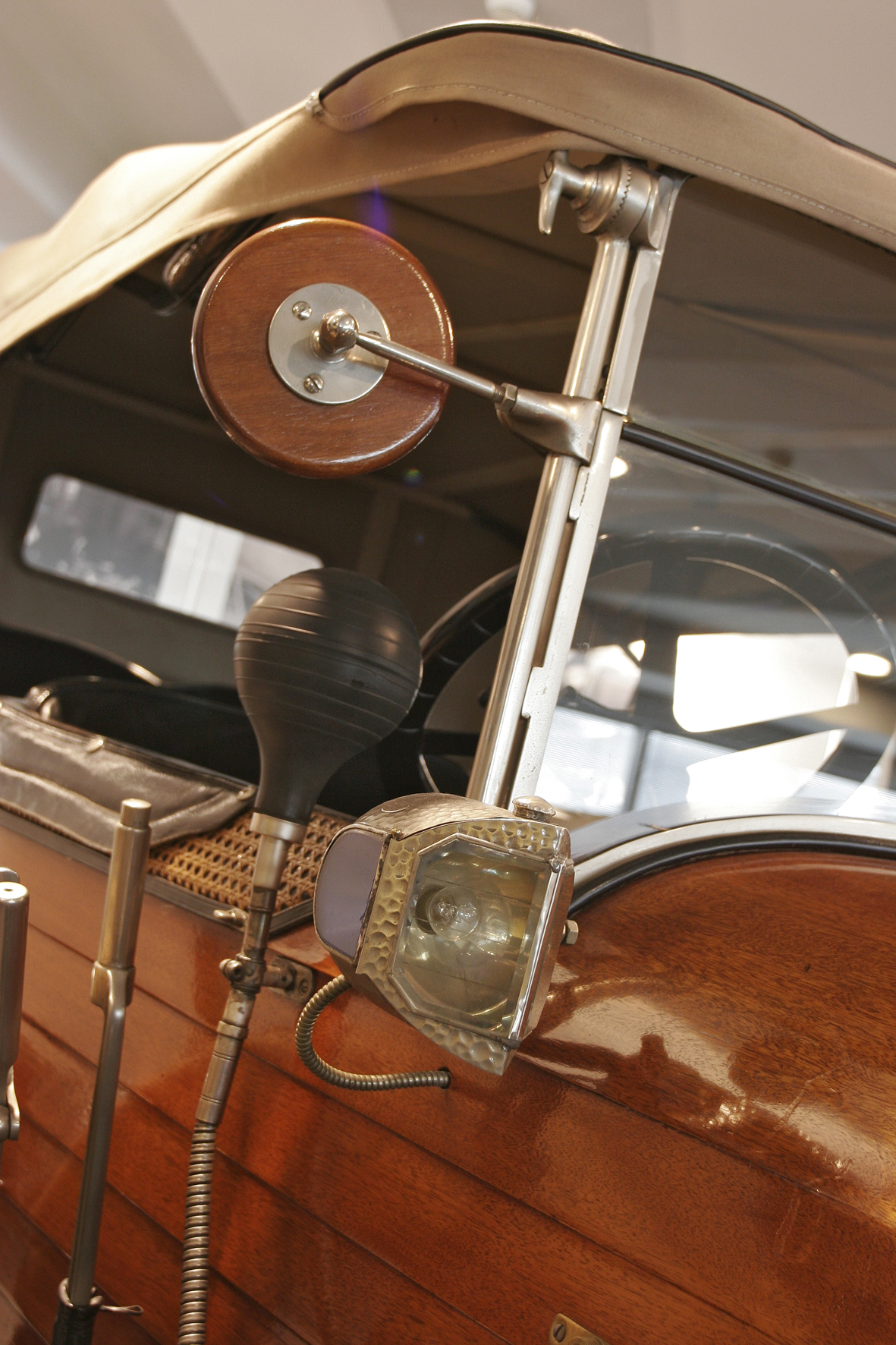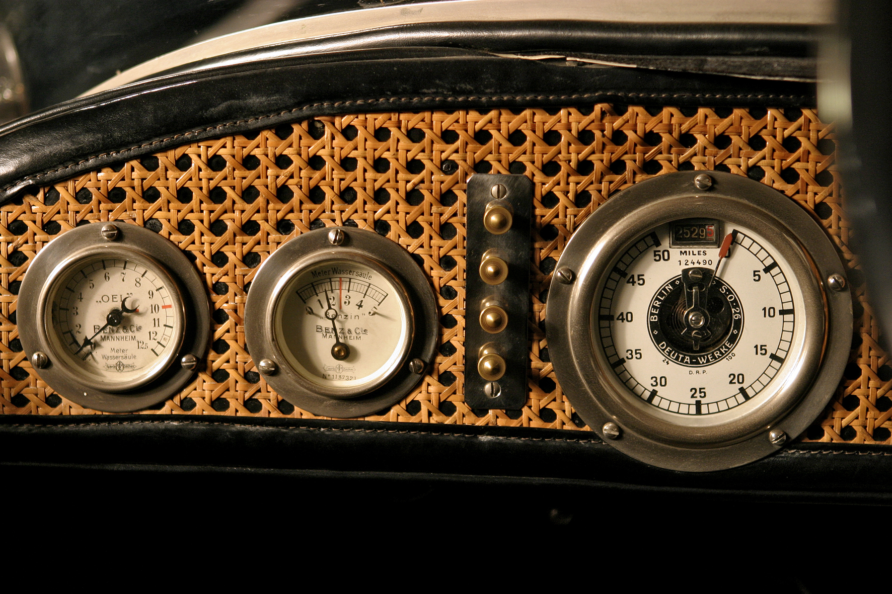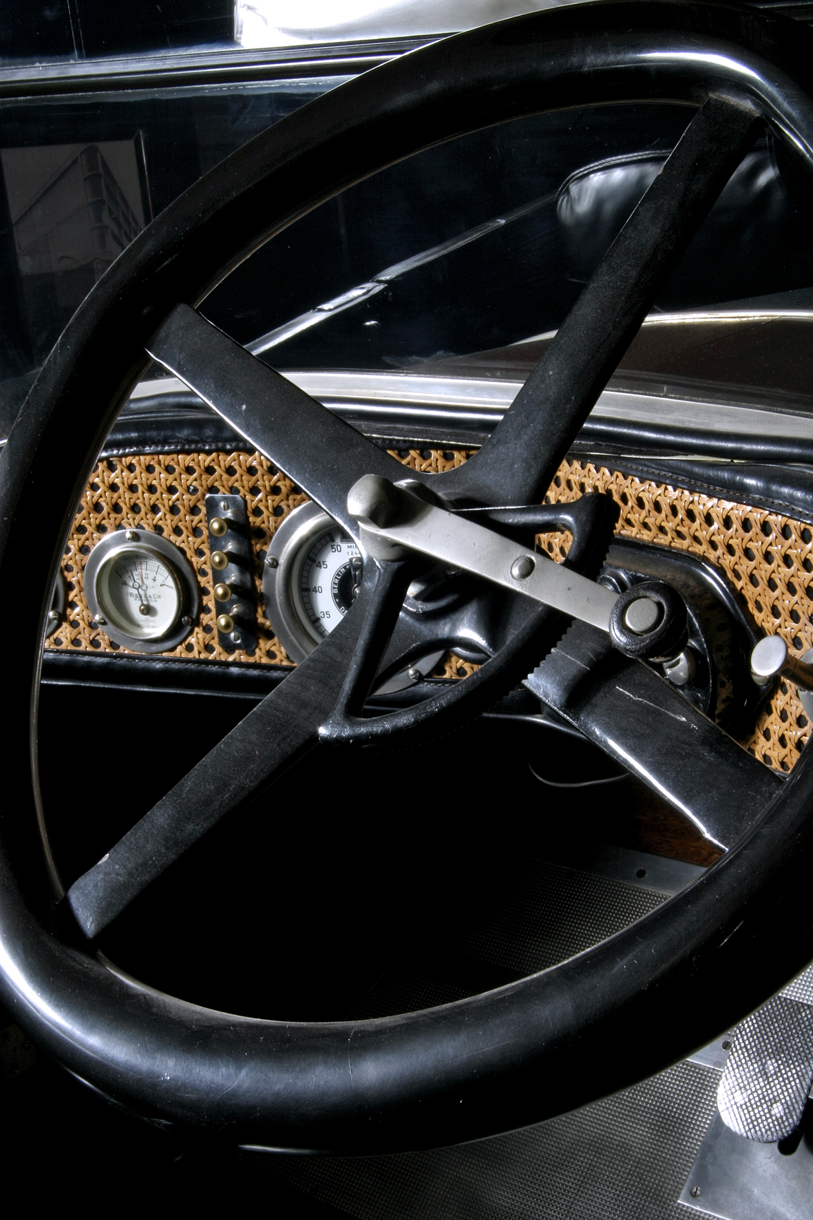 Le più importanti Case Automobilistiche, ad inizio secolo, avevano a listino vetture da corsa accanto a vetture da turismo o rappresentanza. La Benz oltre alle vetture da corsa di 15.000 e 21.500cc e a quelle imponenti di rappresentanza con cilindrata anche oltre gli 8.000cc, produsse, negli anni immediatamente precedenti lo scoppio della guerra, la 8/20 PS, una tranquilla e affidabile vettura da turismo. La vettura esposta è molto prestigiosa e fu ordinata da un maharaja indiano, ciò spiega perché la velocità oraria è indicata in miglia. La particolare e unica carrozzeria è firmata da Schebera, situata a Heilbronn, non lontano da Stoccarda. Gli Schebera, discendevano da una famiglia d’affari, nota nella storia per la costruzione delle armature. La loro esperienza tecnica unisce l’ottone nichelato e lavorato a mano del cofano, del radiatore e dei fanali ai particolari in paglia di Vienna che adornano sia i fianchi della carrozzeria in legno di mogano, sia parte degli interni sia il grande baule esterno. All’interno vi era posto fino a sei persone, grazie anche ai due sedili di emergenza pieghevoli posti davanti all’accogliente divano posteriore. Ricco di strumenti è il cruscotto con indicatore di velocità in miglia; particolare il clacson esterno a forma di serpente boa, aggiunto in epoca successiva.