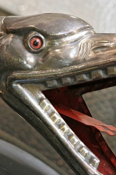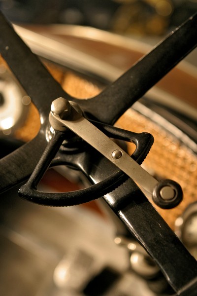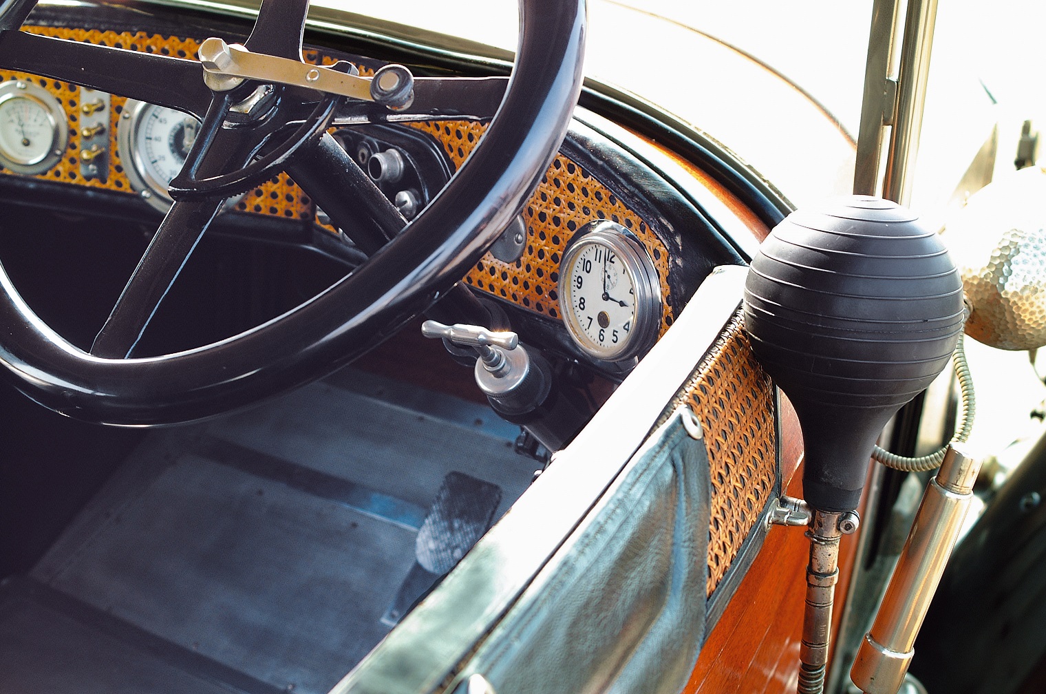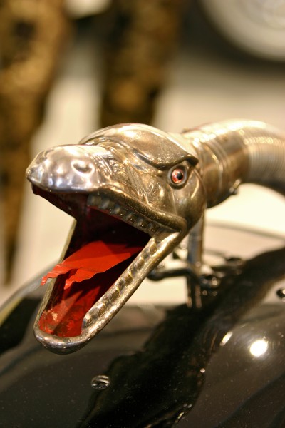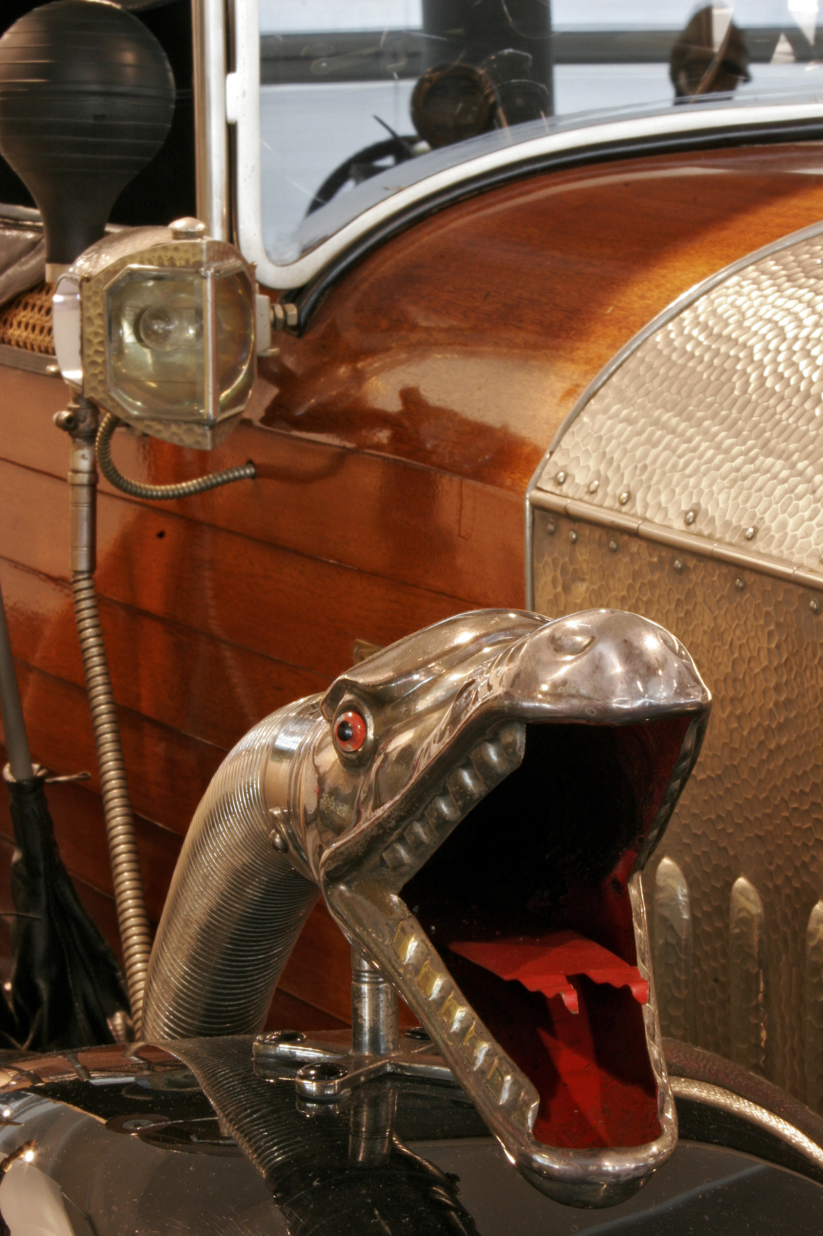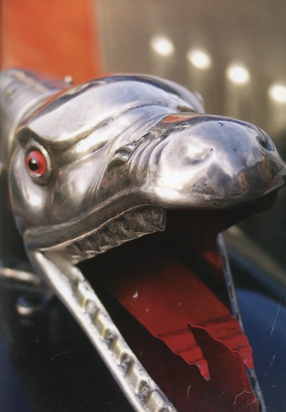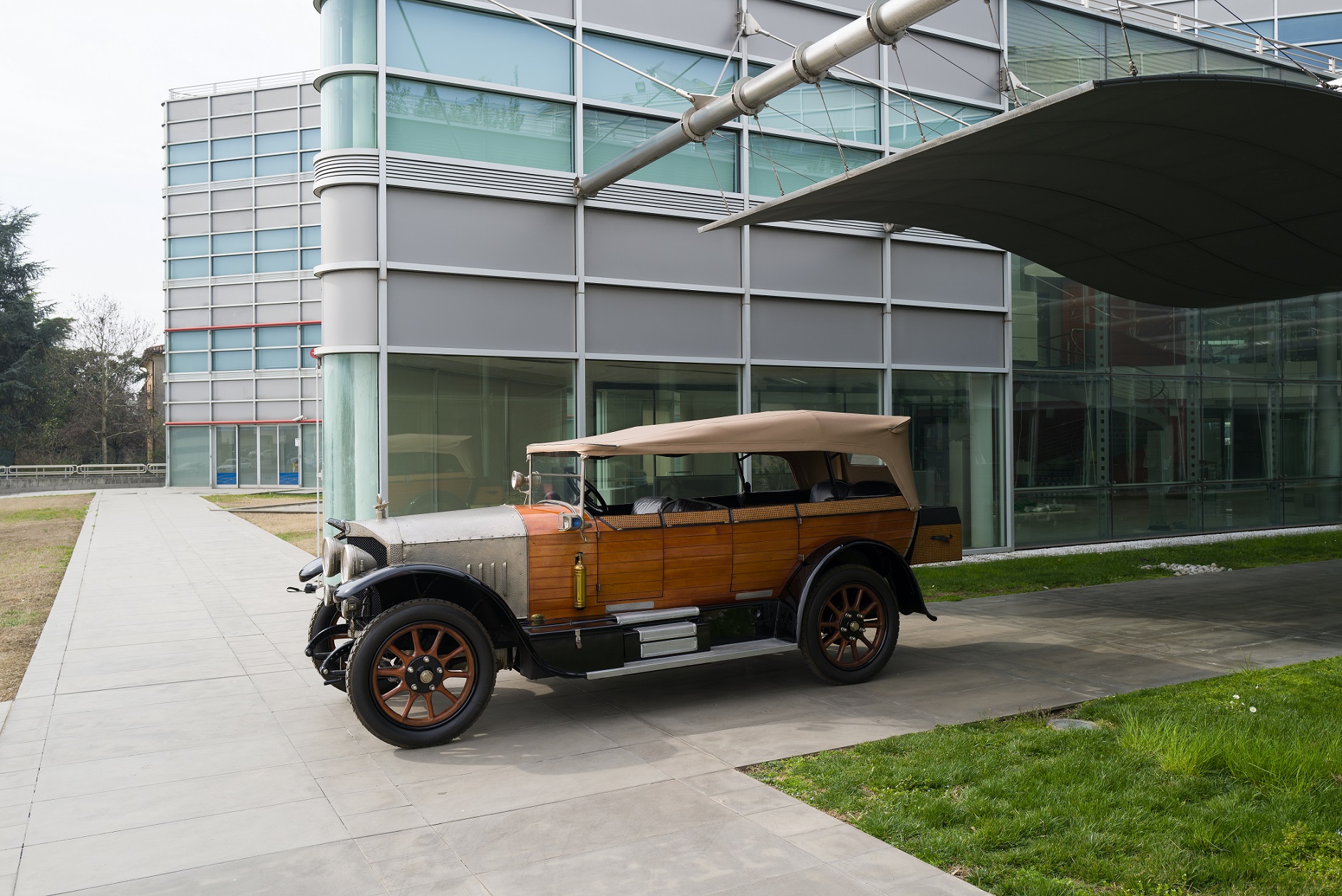 Le più importanti Case Automobilistiche, ad inizio secolo, avevano a listino vetture da corsa accanto a vetture da turismo o rappresentanza. La Benz oltre alle vetture da corsa di 15.000 e 21.500cc e a quelle imponenti di rappresentanza con cilindrata anche oltre gli 8.000cc, produsse, negli anni immediatamente precedenti lo scoppio della guerra, la 8/20 PS, una tranquilla e affidabile vettura da turismo. La vettura esposta è molto prestigiosa e fu ordinata da un maharaja indiano, ciò spiega perché la velocità oraria è indicata in miglia. La particolare e unica carrozzeria è firmata da Schebera, situata a Heilbronn, non lontano da Stoccarda. Gli Schebera, discendevano da una famiglia d’affari, nota nella storia per la costruzione delle armature. La loro esperienza tecnica unisce l’ottone nichelato e lavorato a mano del cofano, del radiatore e dei fanali ai particolari in paglia di Vienna che adornano sia i fianchi della carrozzeria in legno di mogano, sia parte degli interni sia il grande baule esterno. All’interno vi era posto fino a sei persone, grazie anche ai due sedili di emergenza pieghevoli posti davanti all’accogliente divano posteriore. Ricco di strumenti è il cruscotto con indicatore di velocità in miglia; particolare il clacson esterno a forma di serpente boa, aggiunto in epoca successiva.