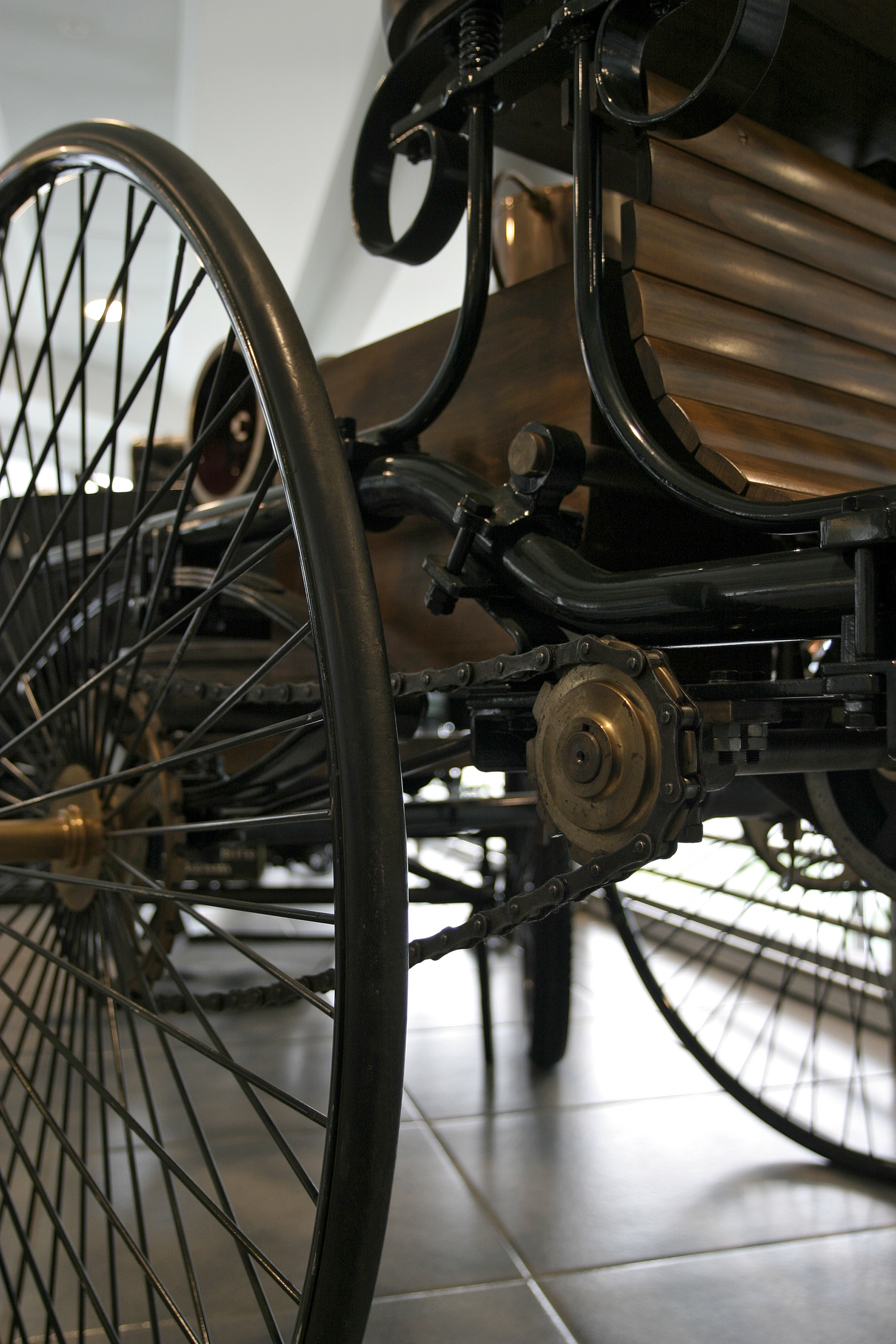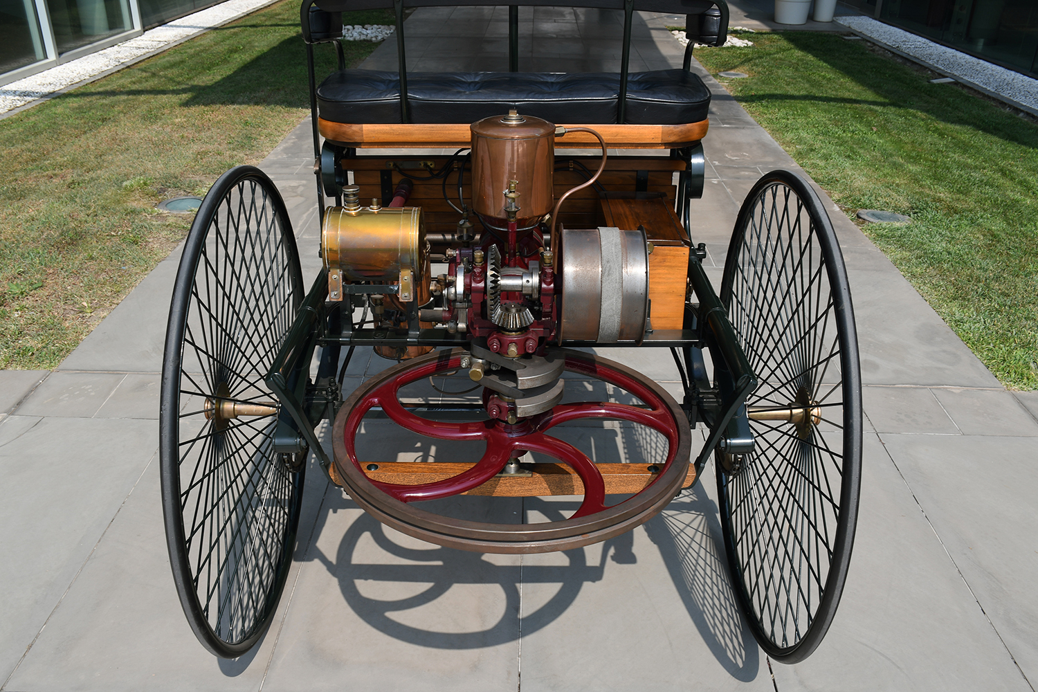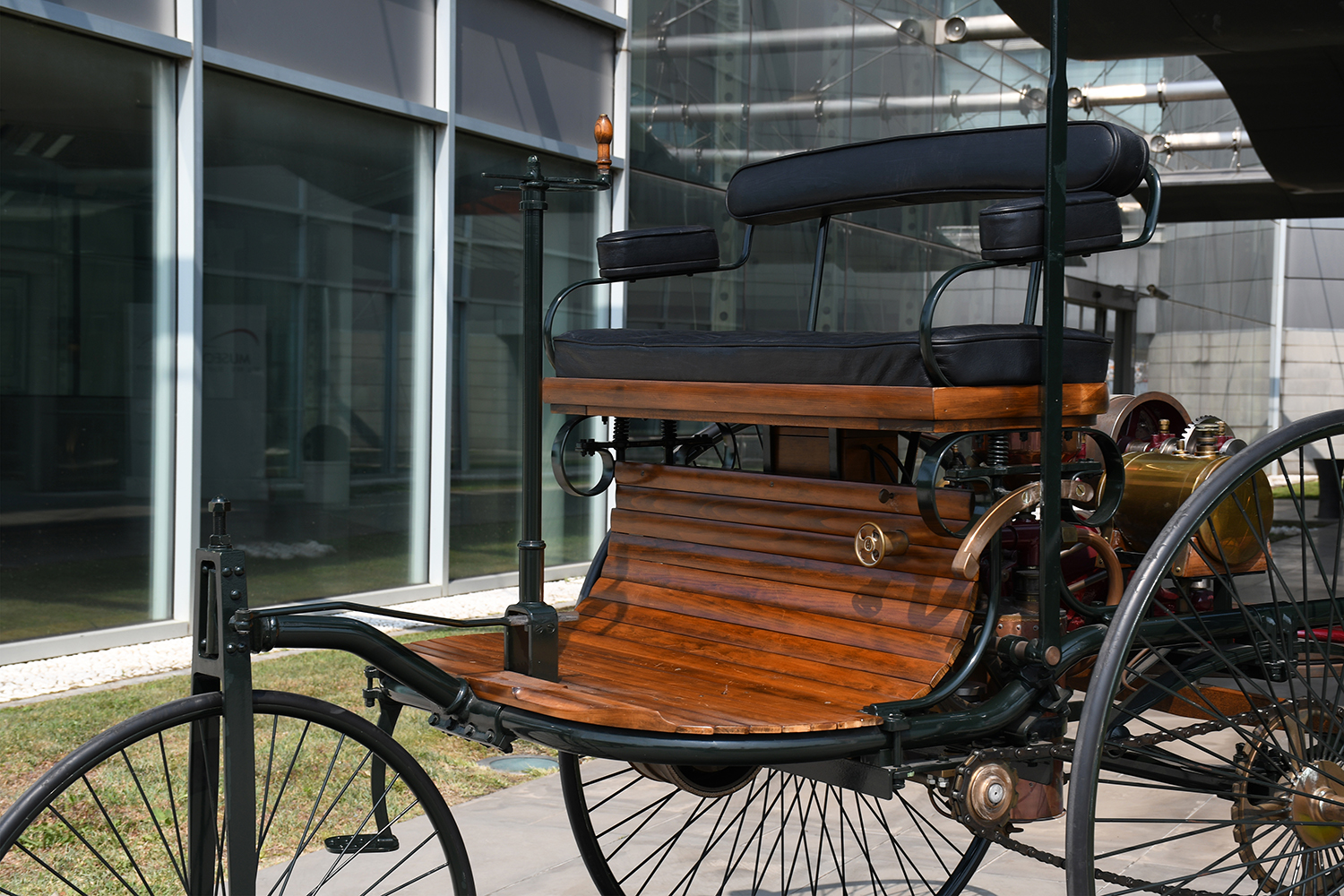 Nel 1886 Karl Benz (Germania 1844-1929), quasi contemporaneamente all’altro tecnico tedesco Gottlieb Daimler, costruì un triciclo azionato da un motore a benzina che collaudò nelle strade di Mannheim, suscitando lo stupore della popolazione. La vettura “senza cavalli”’ stava nascendo! La “Velociped”, considerata la prima vettura al mondo con motore a scoppio, fu progettata in tre varianti fra il 1886 e il 1888. Il terzo modello diventò noto grazie alla moglie di Benz, la signora Bertha, che lo collaudò nell’Agosto 1888 nel viaggio da Mannheim a Pforzheim, accompagnata dai suoi due figli.