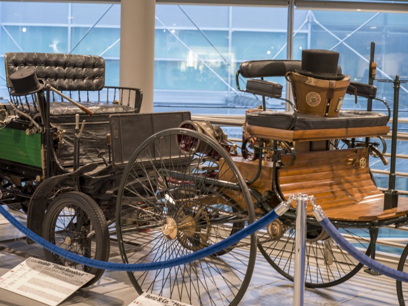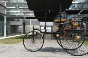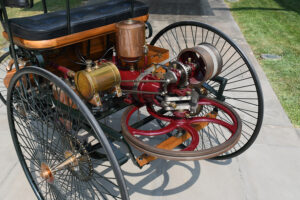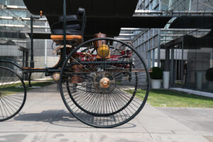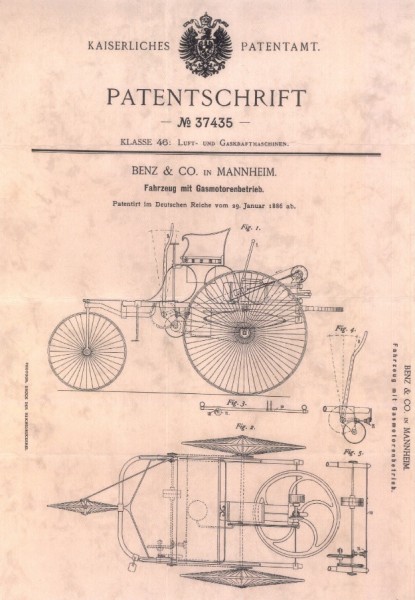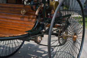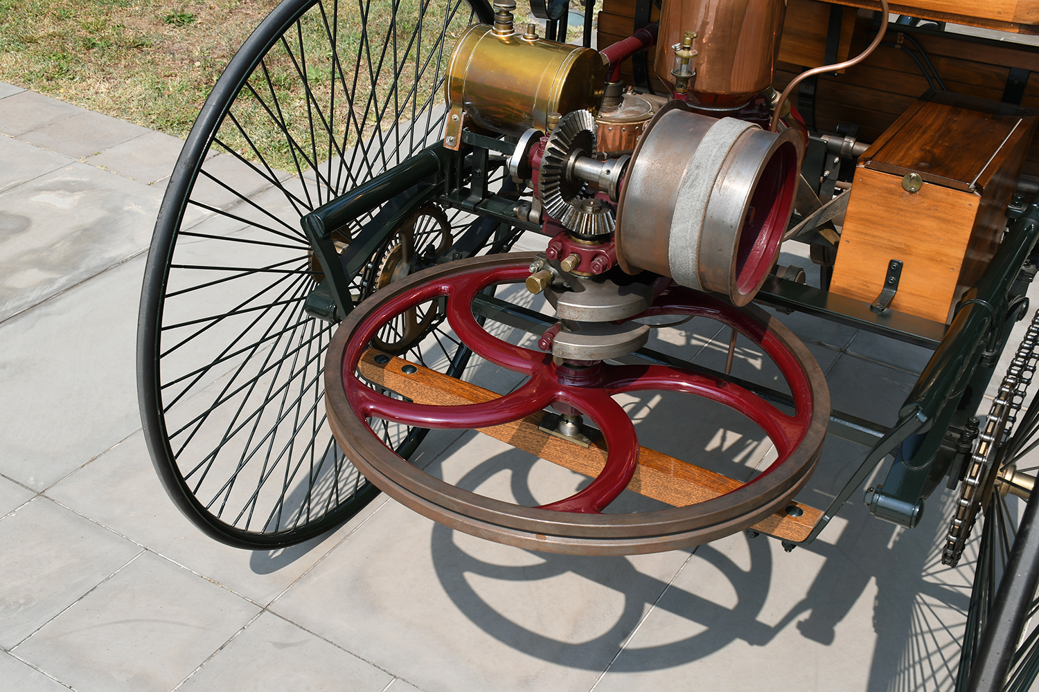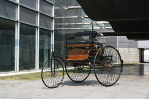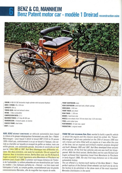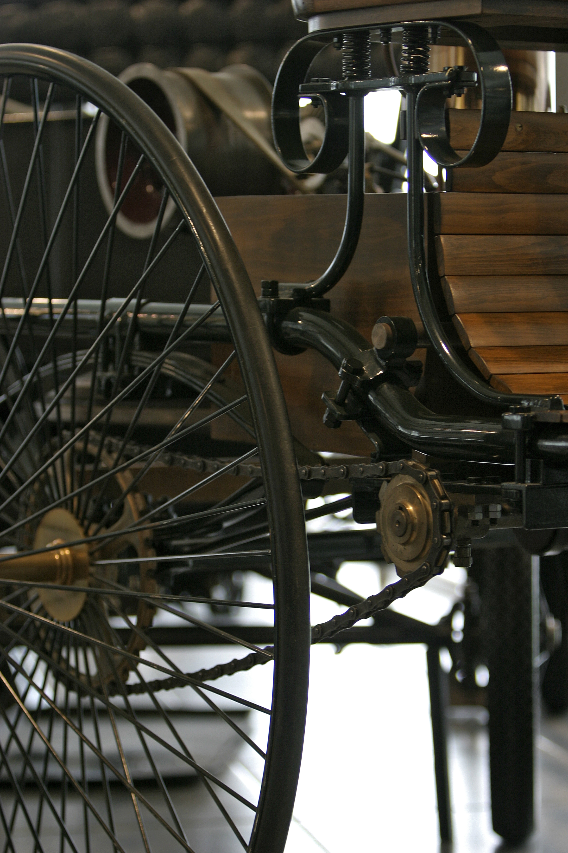 Nel 1886 Karl Benz (Germania 1844-1929), quasi contemporaneamente all’altro tecnico tedesco Gottlieb Daimler, costruì un triciclo azionato da un motore a benzina che collaudò nelle strade di Mannheim, suscitando lo stupore della popolazione. La vettura “senza cavalli”’ stava nascendo! La “Velociped”, considerata la prima vettura al mondo con motore a scoppio, fu progettata in tre varianti fra il 1886 e il 1888. Il terzo modello diventò noto grazie alla moglie di Benz, la signora Bertha, che lo collaudò nell’Agosto 1888 nel viaggio da Mannheim a Pforzheim, accompagnata dai suoi due figli.