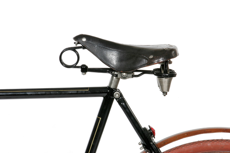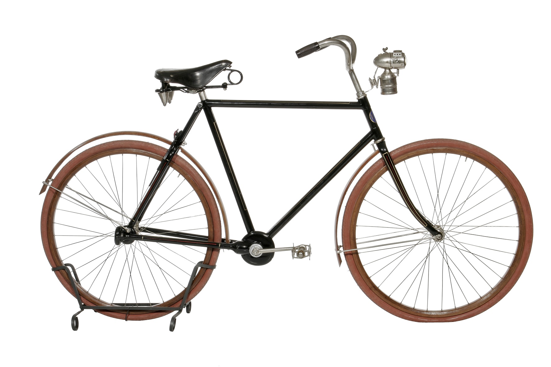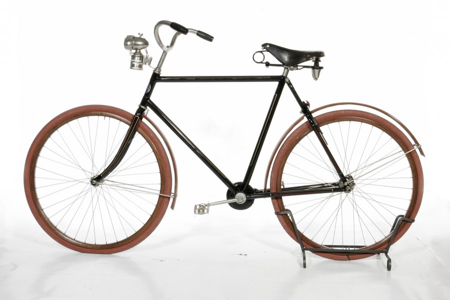 Questa bici, prodotta in Belgio nel 1899, era un' autentica “sciccheria” per l’epoca. Dotata di cerchi in legno con pneumatici in caucciù, parafanghi in legno, fanale ad acetilene e frenata a contropedale, presentava il nuovo metodo di trasmissione a cardano, cioè senza catena. Il cardano era molto costoso in quanto le eventuali riparazioni richiedevano ricambi ad hoc non sempre reperibili e un meccanico specializzato.