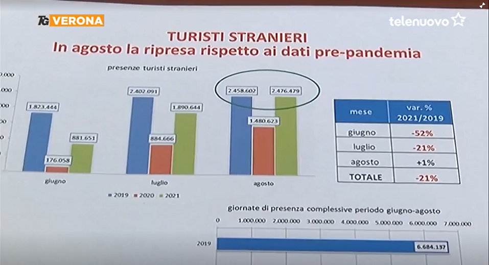 La comparazione tra agosto 2021 e 2019, messa in luce, nella parte in inglese della conferenza, anche da parte di Annachiara De Carlo, responsabile Ufficio Turismo e Cultura Camera di Commercio di Verona, ha visto un incremento delle presenze straniere (+1%), ma allo stesso tempo anche di quelle italiane. L’aumento dei turisti italiani sulla sponda veronese del Lago di Garda ha riguardato anche giugno e luglio.