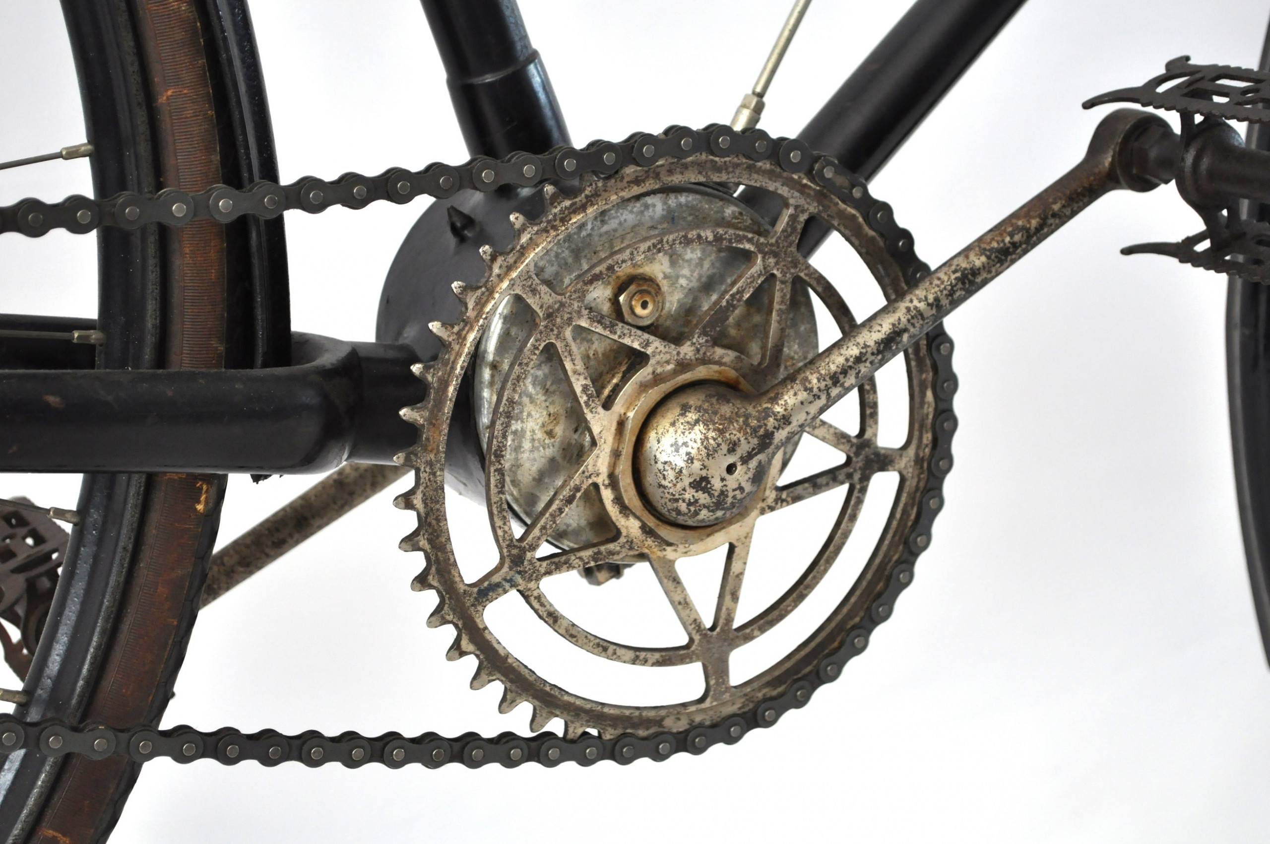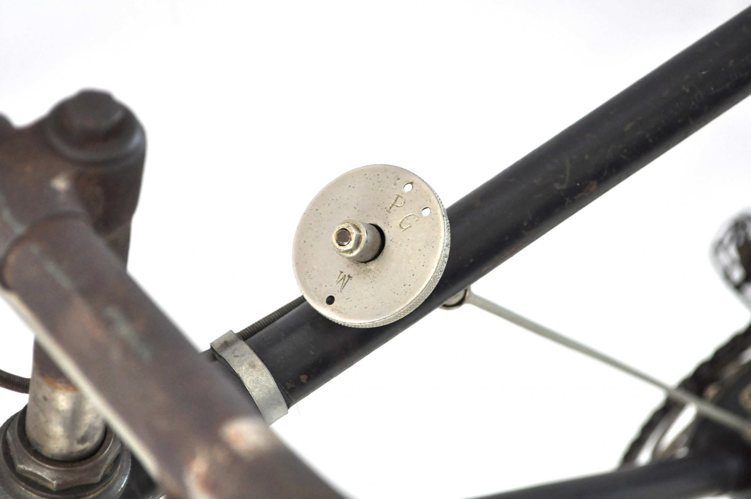 - 2/3-Gang-Getriebe an der Vorderradnabe, betätigt über eine Welle am horizontalen Rohr. Diese Art von Getriebe ist ein Patent von Magnat & Debon und hat das Unternehmen in der Radsportwelt bekannt gemacht