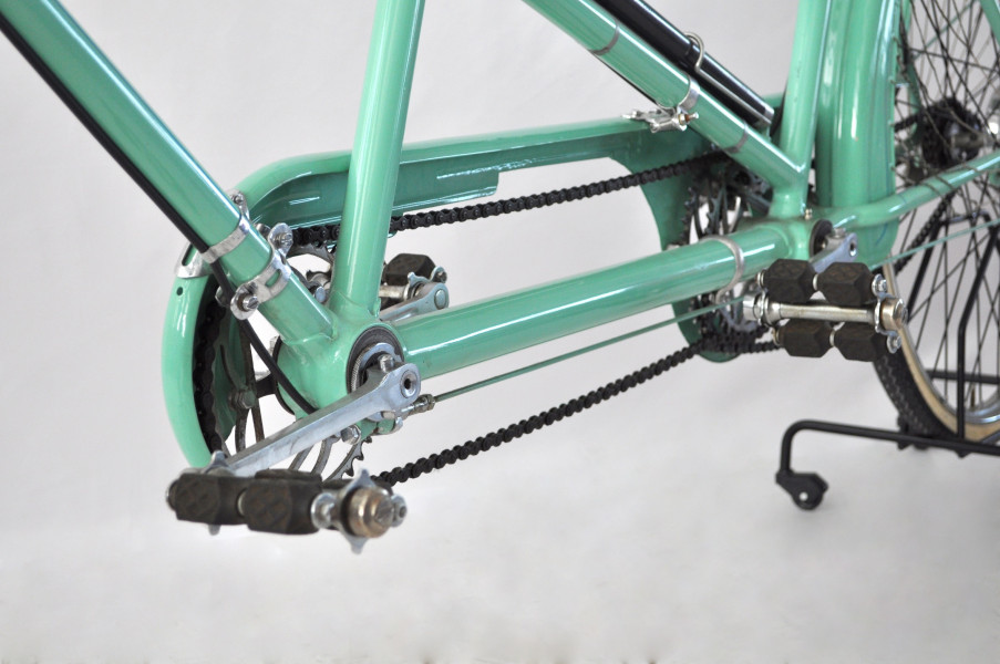 Die beiden Pedalsätze sind auf der linken Seite durch eine Kette verbunden, während die beiden Kurbelsätze gleich groß sind. Von den Pedalen des Beifahrers sind zwei Ketten mit dem Hinterrad verbunden.
