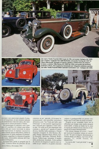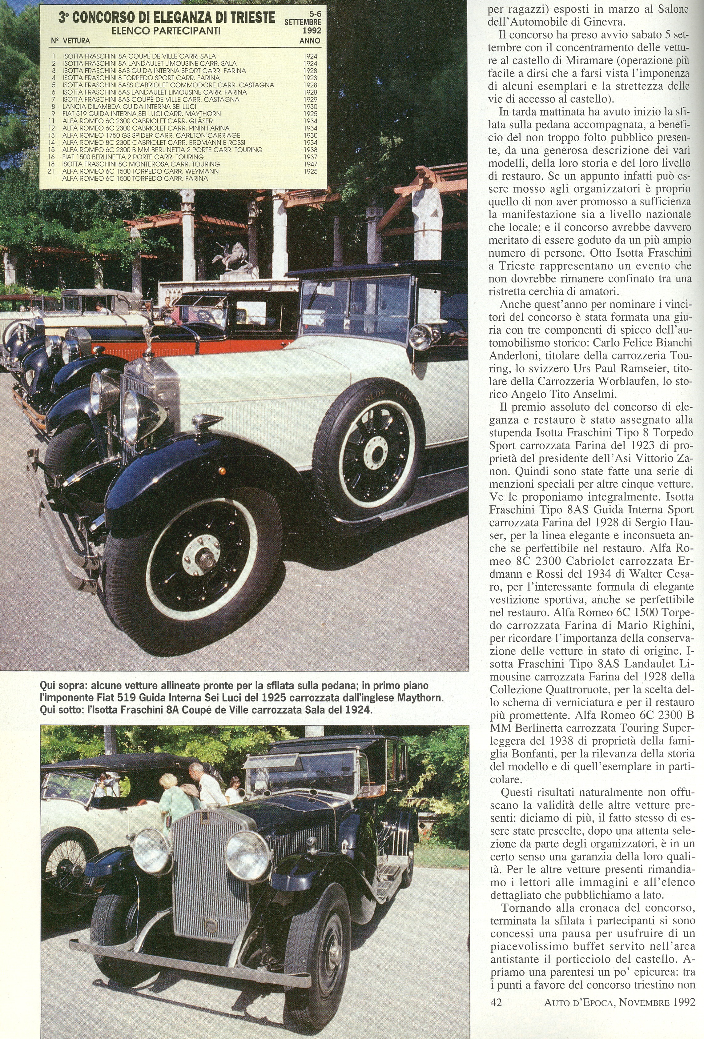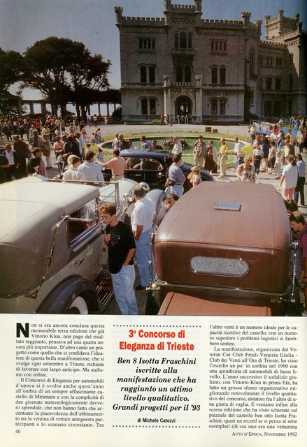 „Ben 8 Isotta Fraschini iscritte alla manifestazione che ha raggiunto un ottimo livello qualitativo. Grandi progetti per il 1993. E‘ stata formata una giuria con tre componenti di spicco dell’automobilismo storico: Carlo Felice Bianchi Anderloni, titolare della carrozzeria Touring, lo svizzero Urs Paul Ramseier, titolare della carrozzeria Worblaufen, lo storico Angelo Tito Anselmi„.