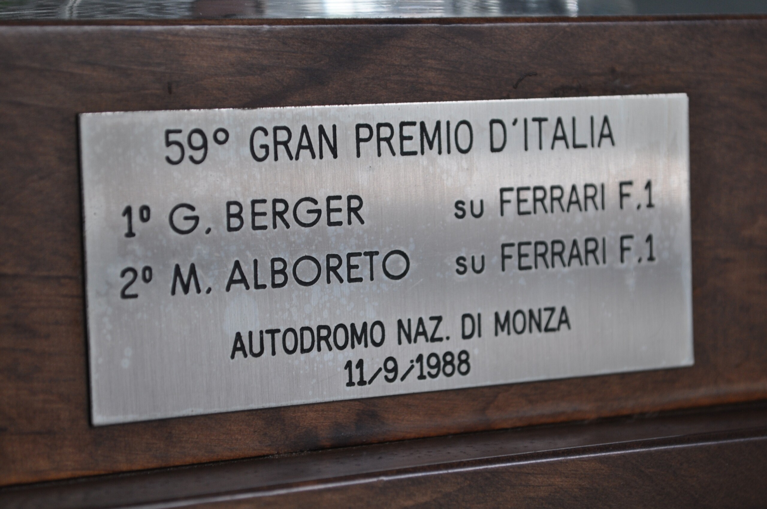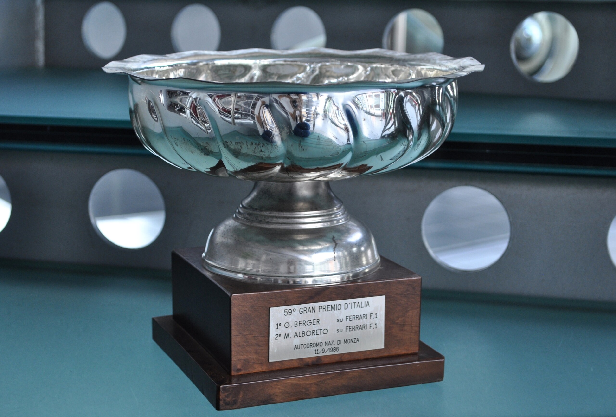 Die im Museo Nicolis ausgestellte Trophäe ist die Konstrukteurs-Trophäe, daher das Schild mit den beiden Ferrari-Fahrernamen.