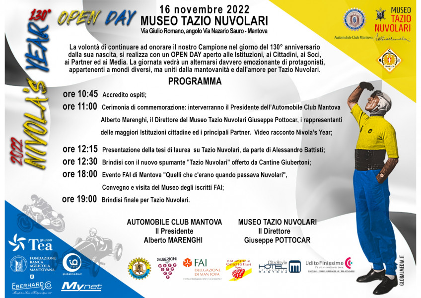 Mittwoch 16. November an Museo Tazio Nuvolari aus Mantova ein open day, um den 130. Jahrestag der Geburt von Tazio Nuvolari zu feiern.