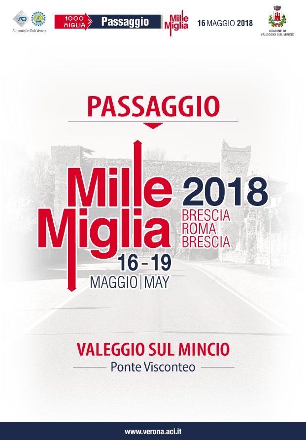 „Mille Miglia a Valeggio sul Mincio: la Freccia Rossa attraverserà il Ponte Visconteo di Borghetto a Verona. A seguito della variazione del percorso per esigenze tecnico-organizzative, l’edizione 2018 avrà come unica tappa di passaggio in Veneto quella di Valeggio sul Mincio. L’Automobile Club Verona, grazie alla collaborazione del Comune di Valeggio sul Mincio, ha così fatto inserire un controllo a timbro ufficiale sul Ponte Visconteo di Borghetto, dove i concorrenti, in arrivo da Brescia, dovranno fermarsi da regolamento.