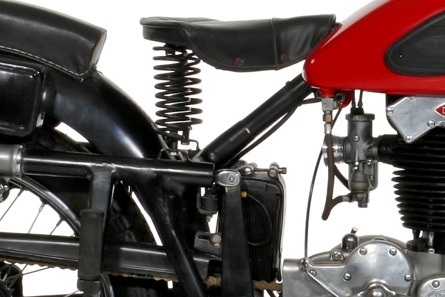 Der Rohrrahmen besteht aus einer einzigen offenen Halterung; Es zeigt eine Trägergabel vorne, während hinten auf jeder Seite des Rades ein paar Federn mit Kompassdämpfern angebracht sind.