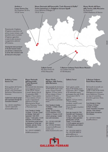 Fino al 31 ottobre i visitatori avranno l’opportunità unica di usufruire di agevolazioni all’ingresso negli altri musei con il biglietto acquistato nella prima struttura visitata, e potranno soprattutto prenotare eccezionalmente la visita a due collezioni private: la Collezione Umberto Panini, il museo con una delle più complete collezioni di Maserati e il Centro Storico Fiat, inaugurato nel 1963 che ha sede nel primo ampliamento delle officine di Corso Dante a Torino, dove nacque l’azienda.