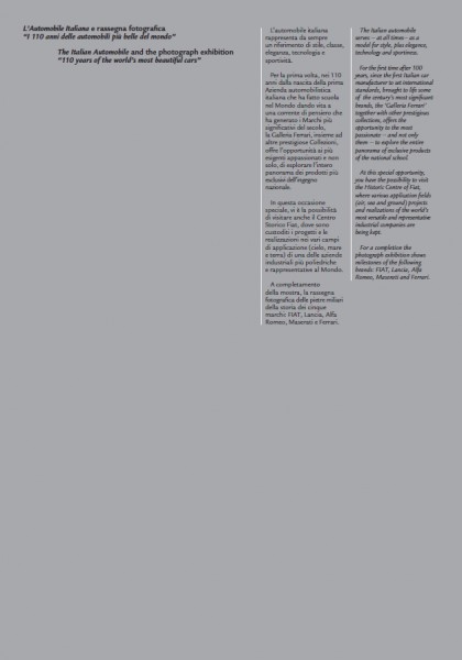 L’Automobile Italiana, simbolo di stile, classe, eleganza, tecnologia e sportività, è al centro di un’iniziativa originale dove i diversi Marchi che la rappresentano si incontrano in un itinerario alla scoperta dei prodotti più esclusivi dell’ingegno nazionale, dal 1899, anno di fondazione di Fiat, ad oggi.