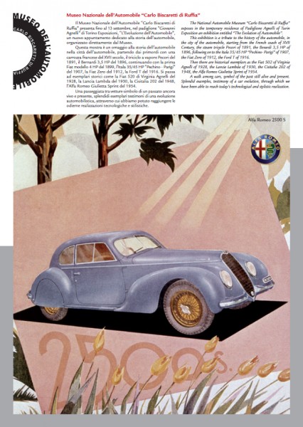 Per l’occasione Galleria Ferrari, museo ufficiale della Casa del Cavallino Rampante  promotore della mostra, accanto alla collezione permanente di monoposto e Granturismo che hanno fatto la storia del Cavallino, rende omaggio a capolavori di tecnica come la FIAT 130 HP del 1907, la Lancia Aurelia B 24 del 1954, l’Alfa Romeo 8C 2900 B del 1938 e la Maserati A6 1500 del 1948, oltre a proporre una completa rassegna fotografica con “I 110 Anni delle Automobili più Belle del Mondo” e i filmati storici originali dei vari Marchi.