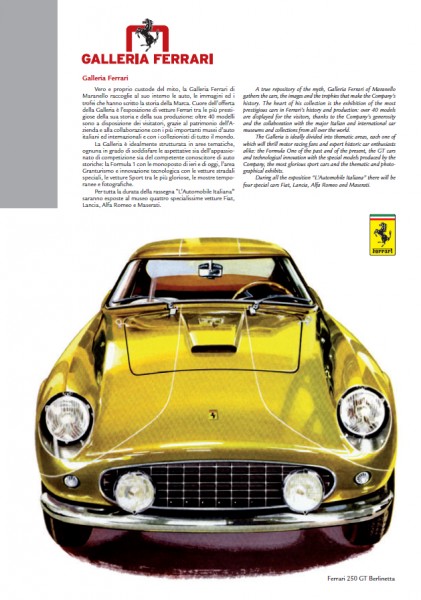 Galleria Ferrari partecipa all’esposizione insieme ad altre prestigiose collezioni: il Museo dell’Automobile di Torino nella sede di Torino Esposizioni, la Collezione Umberto Panini a Corlo di Formigine (a pochi chilometri da Maranello), il Museo Nicolis dell’Auto, della Tecnica, della Meccanica a Villafranca di Verona e,il Centro Storico Fiat, dove sono custoditi i progetti e le realizzazioni nei vari campi di applicazione (cielo, mare e terra) di una delle aziende industriali più poliedriche e rappresentative al Mondo.
