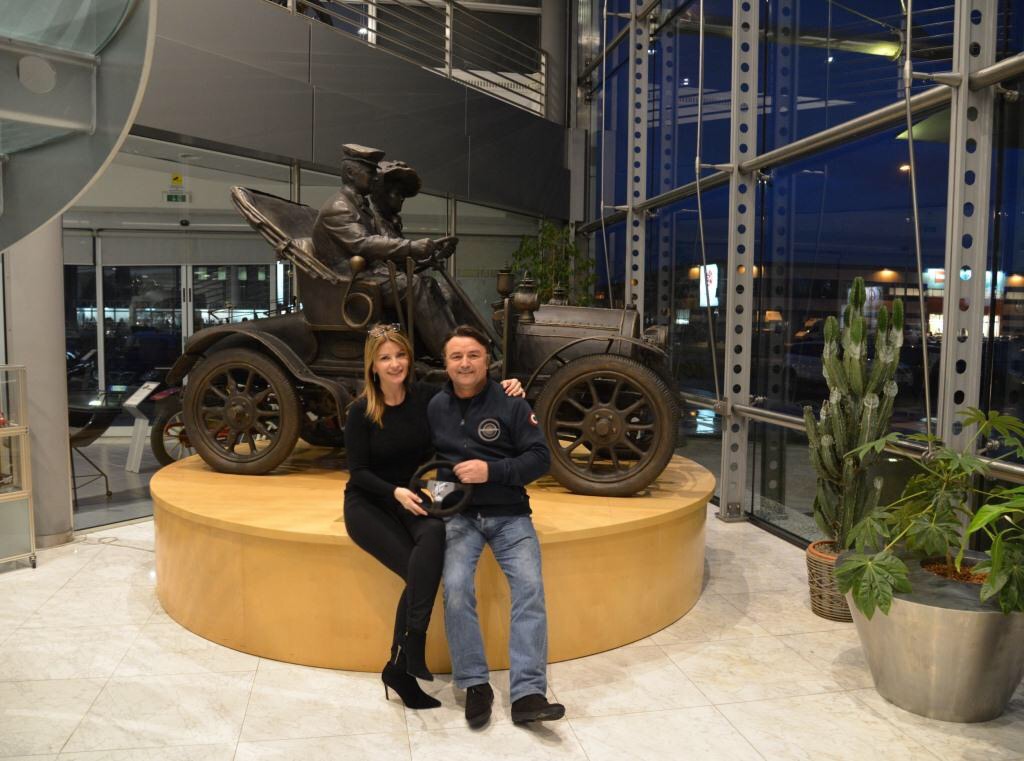 René Arnoux al Museo Nicolis con Silvia Nicolis., autografa il suo volante originale F1 che fa parte della nostra prestigiosa e rara collezione di volanti F1.