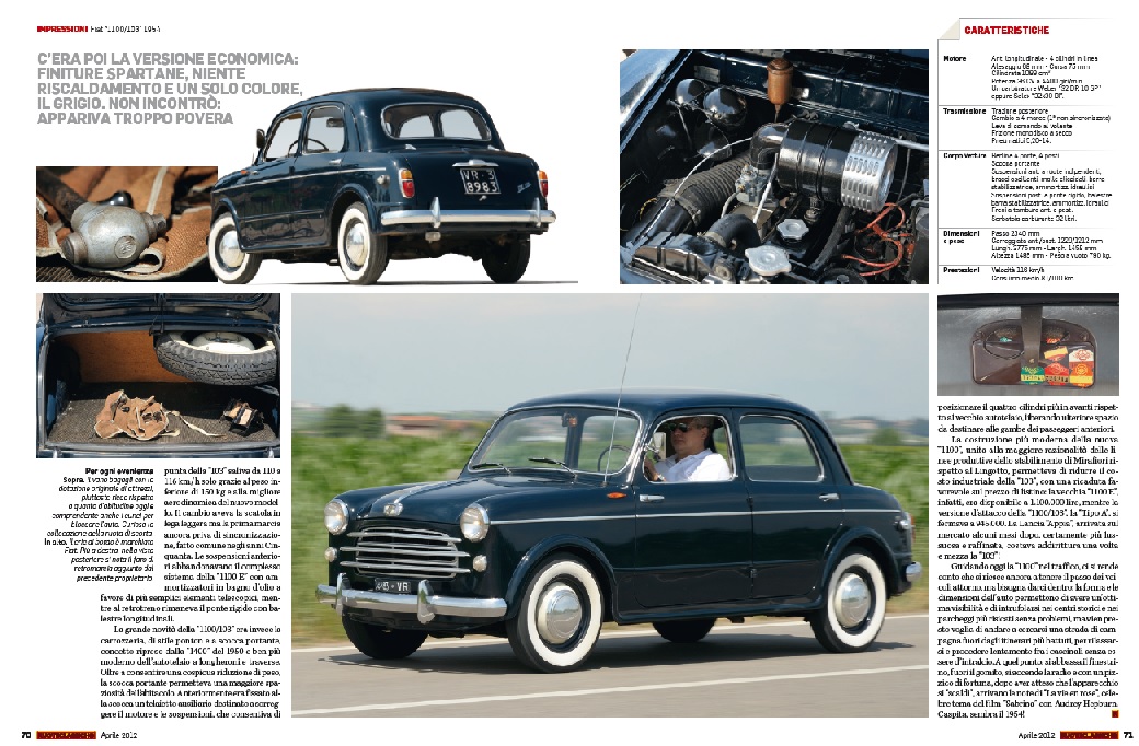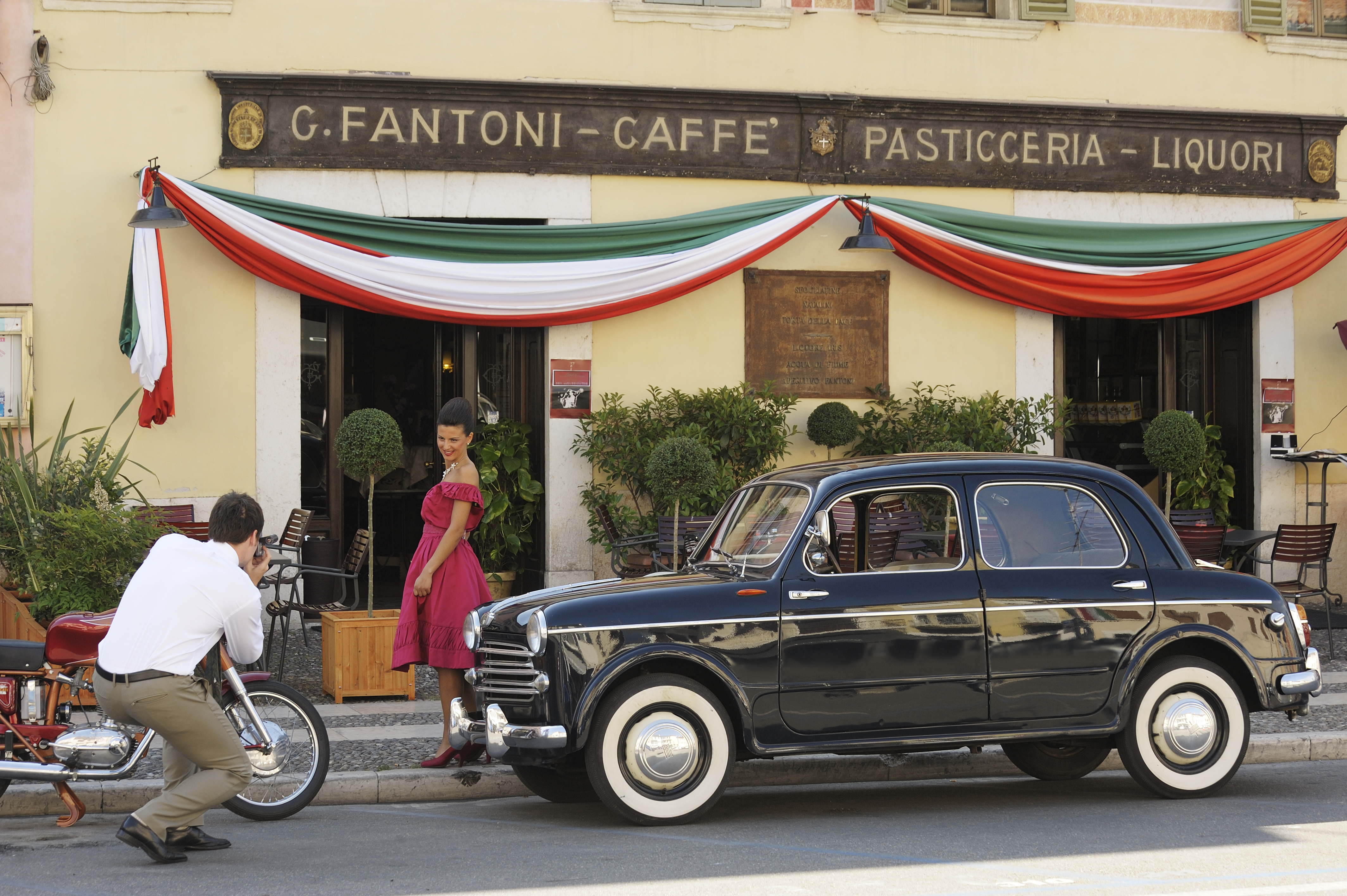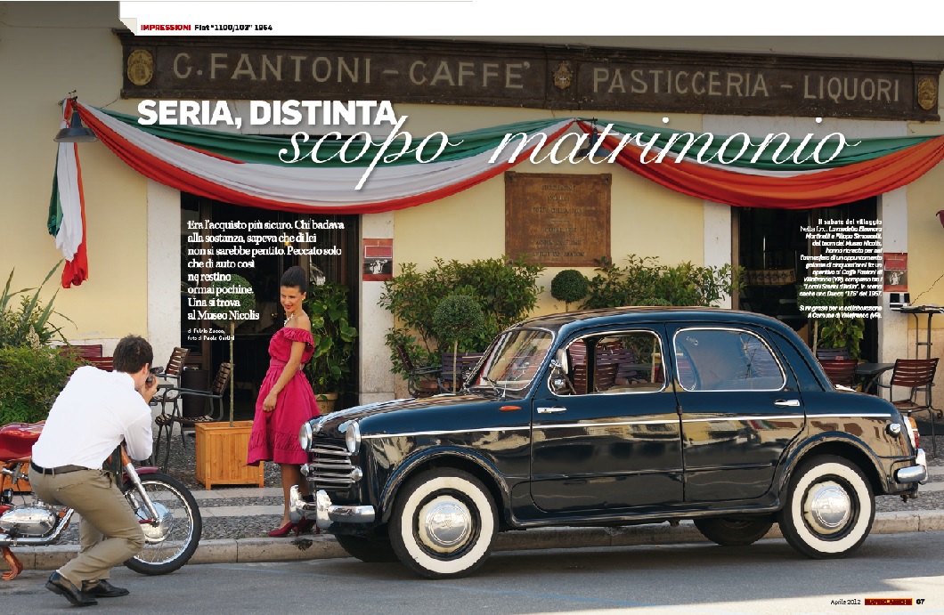 Das Fiat 1100 Wagen von Museo Nicolis ist Protagonist im Shooting Ruoteclassiche, das im Zentrum von Villafranca in den historischen Caffè Fantoni und Schloss spielt.