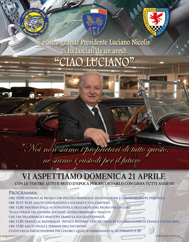 Alle 9.00 verrà celebrata la messa al Museo Nicolis, potrà partecipare chi lo vorrà. Per l'iscrizione alla manifestazione "Ciao Luciano" ed il relativo pranzo i recapiti da contattare sono: