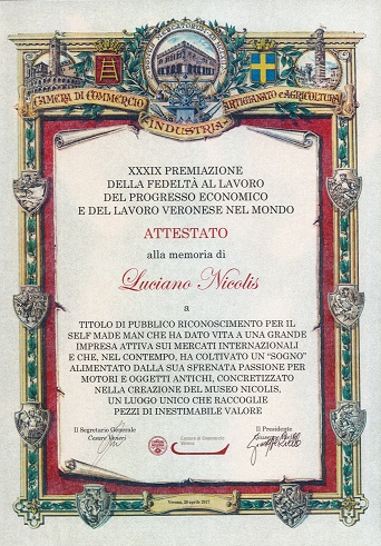 E’ stato assegnato a Luciano Nicolis il Premio Speciale “Fedeltà al Lavoro” alla Memoria, conferito da Camera di Commercio Verona, con la seguente motivazione: