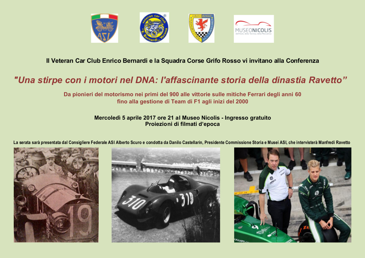 Dunque una serata da non perdere, dedicata a una famiglia con il DNA delle corse nel sangue, in un  contesto affascinante come il Museo Nicolis. “Le corse mi aiutano a spazzare via tutte le preoccupazioni dalla mente”, racconta Manfredi Ravetto, “perchè quando ti cali nell’abitacolo, chiudi la porta, allacci le cinture e abbassi la visiera del casco, sei solo con la macchina e non c’è posto per nient’altro”.
