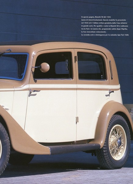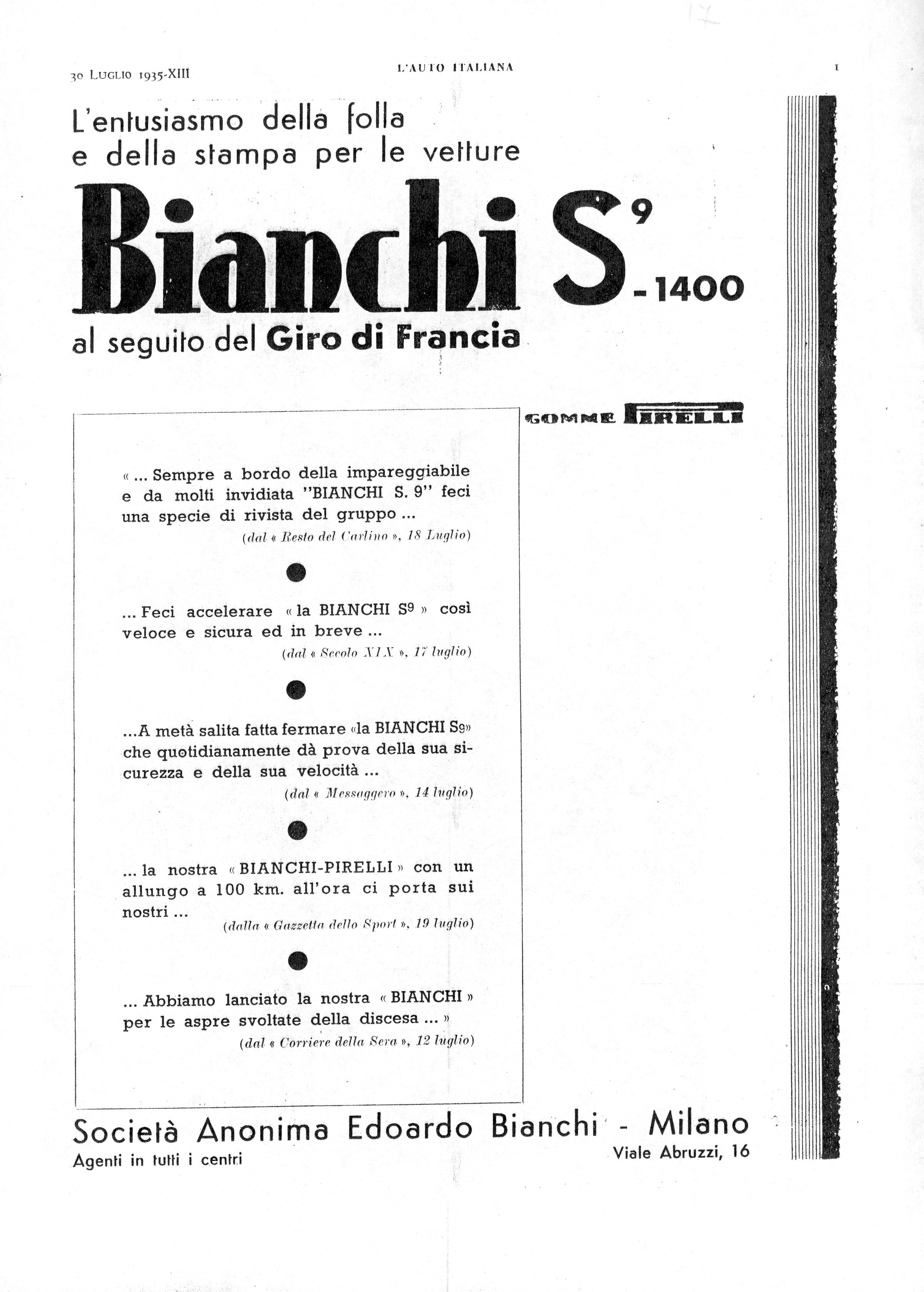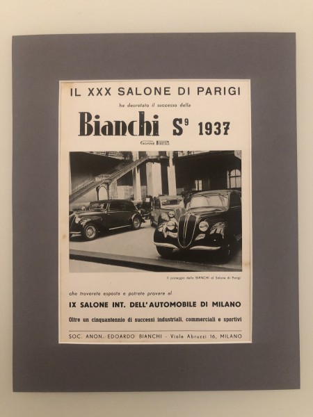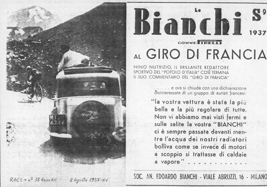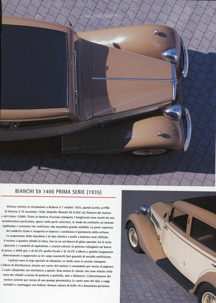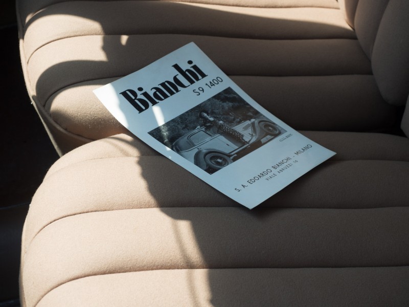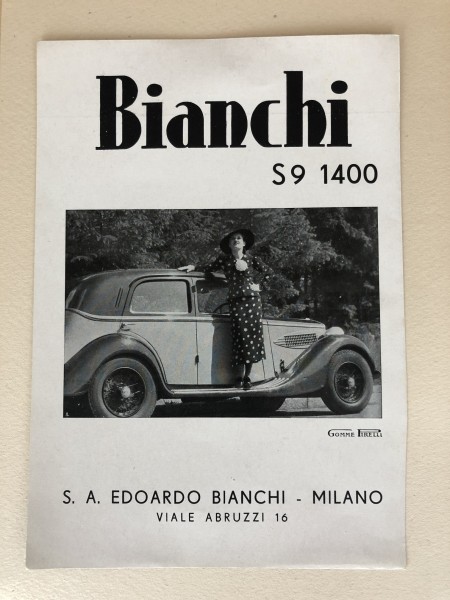 The Bianchi S9 was one of the most known models after the Giro d’Italia; this 1400 cc modified car, with no roof and sometimes no doors at all to intervene as soon as possible to change tires, was the flagship of Bianchi racing team. For many years this sedan followed and supported Fausto Coppi in his epic victories immortalized by sports reporters in many occasions that drew the history of this sport.