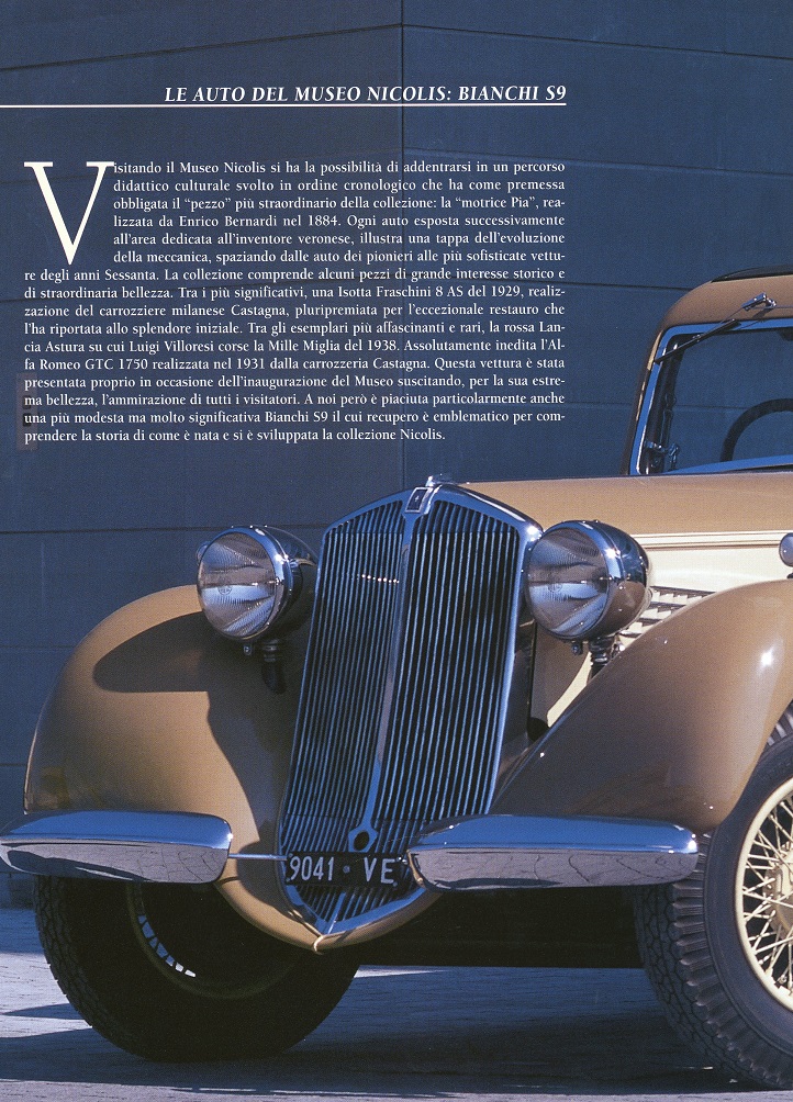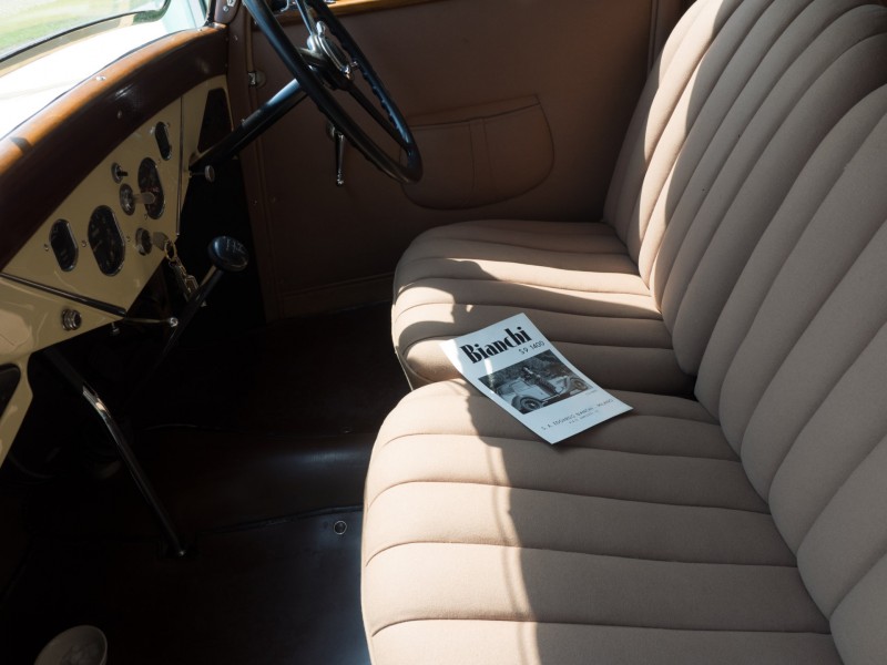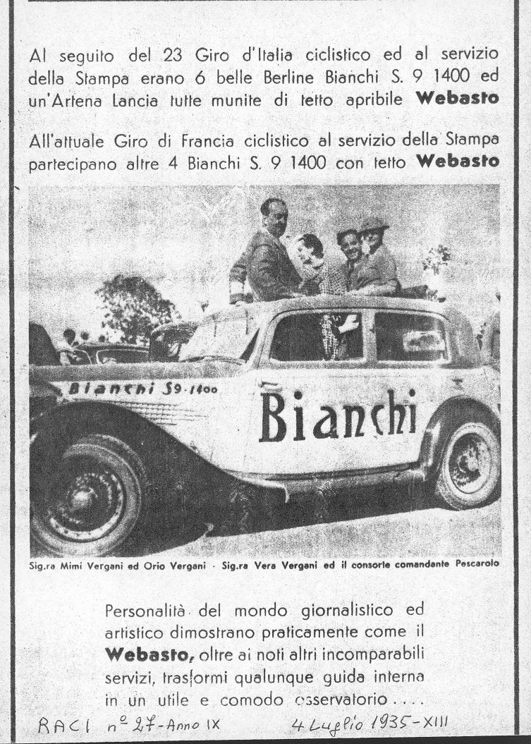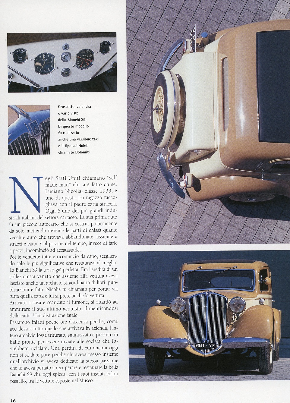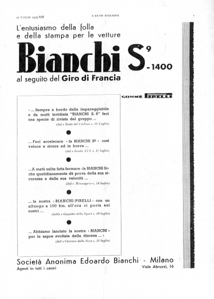 The Bianchi S9 was one of the most known models after the Giro d’Italia; this 1400 cc modified car, with no roof and sometimes no doors at all to intervene as soon as possible to change tires, was the flagship of Bianchi racing team. For many years this sedan followed and supported Fausto Coppi in his epic victories immortalized by sports reporters in many occasions that drew the history of this sport.