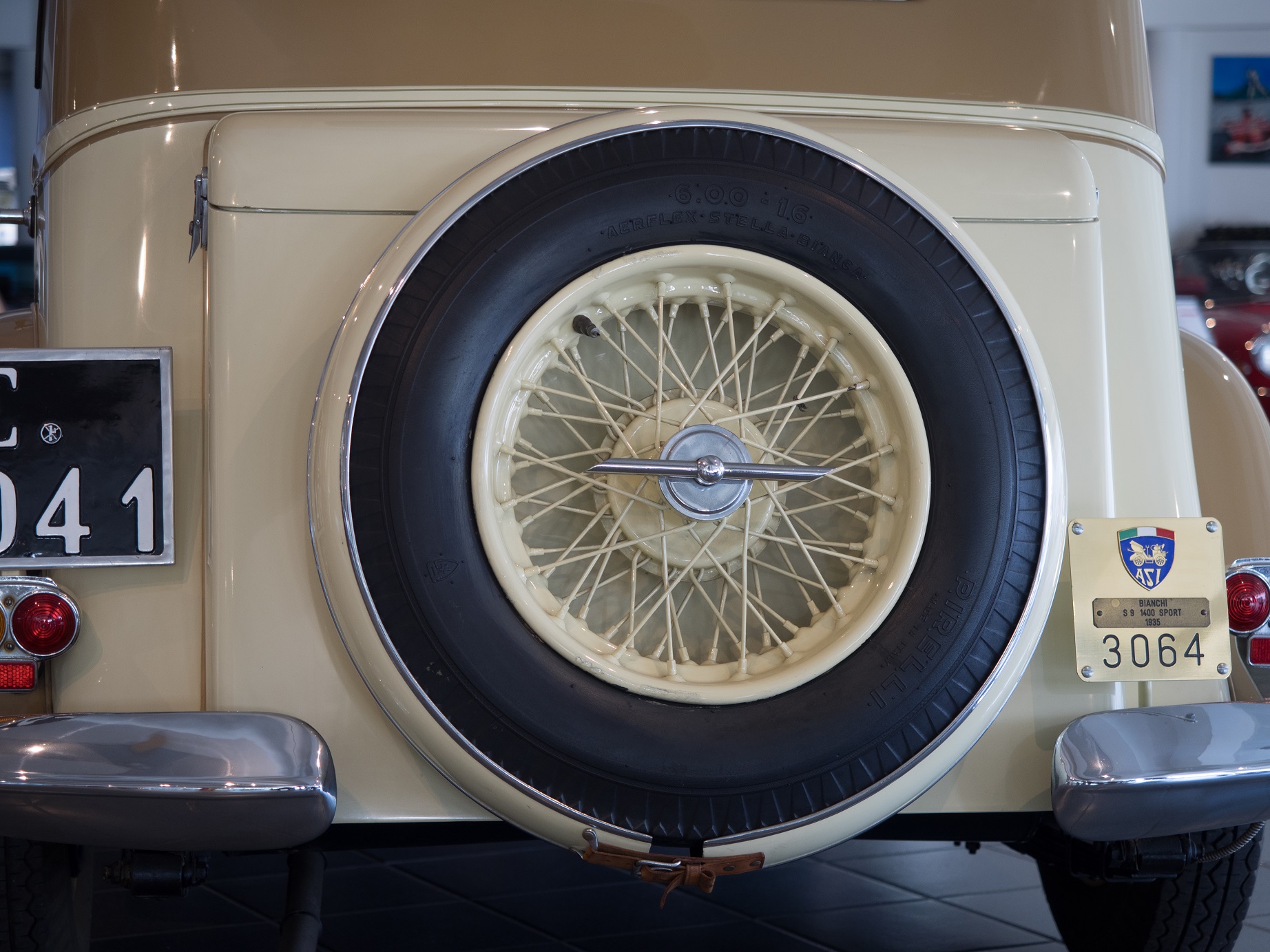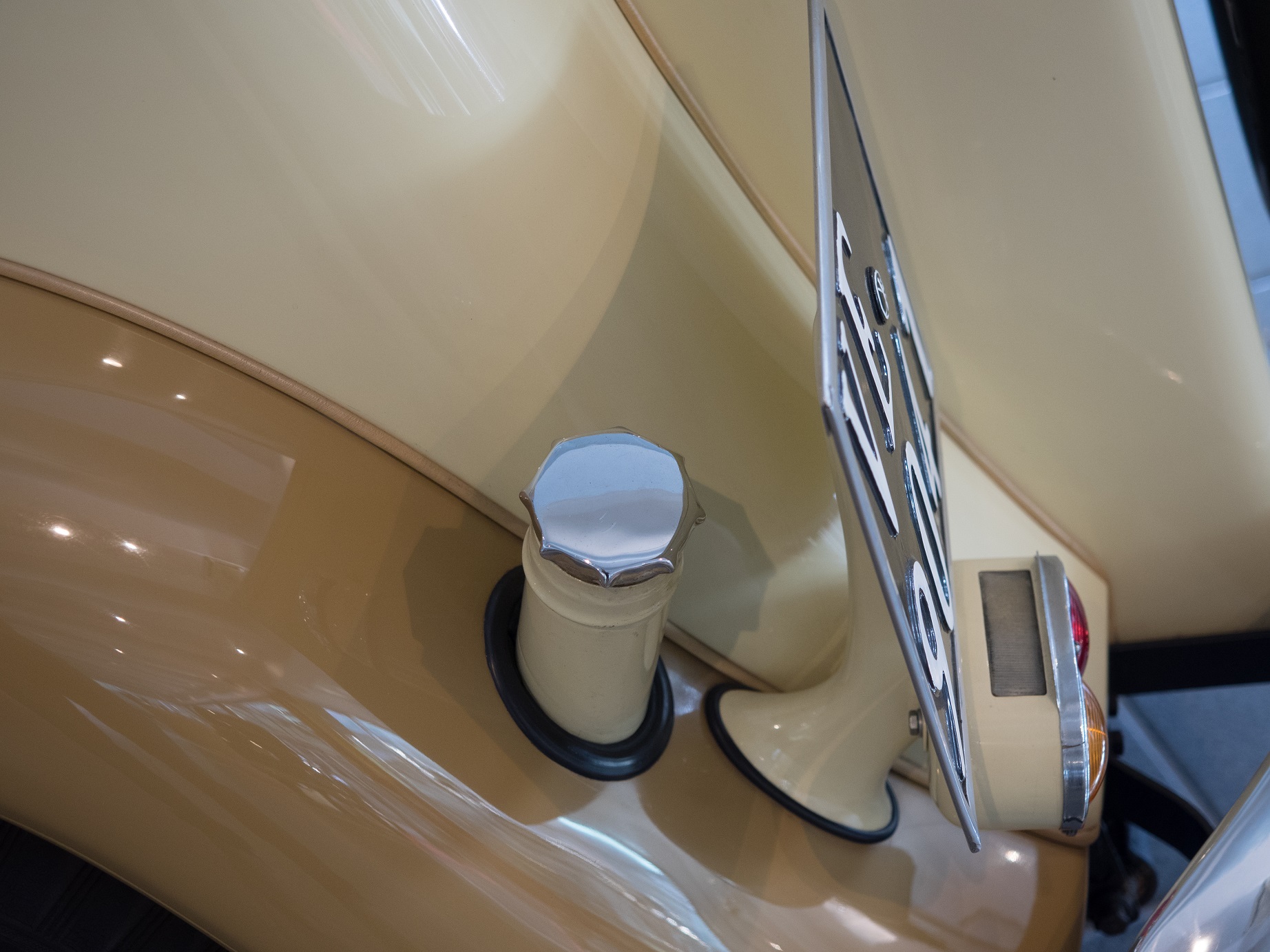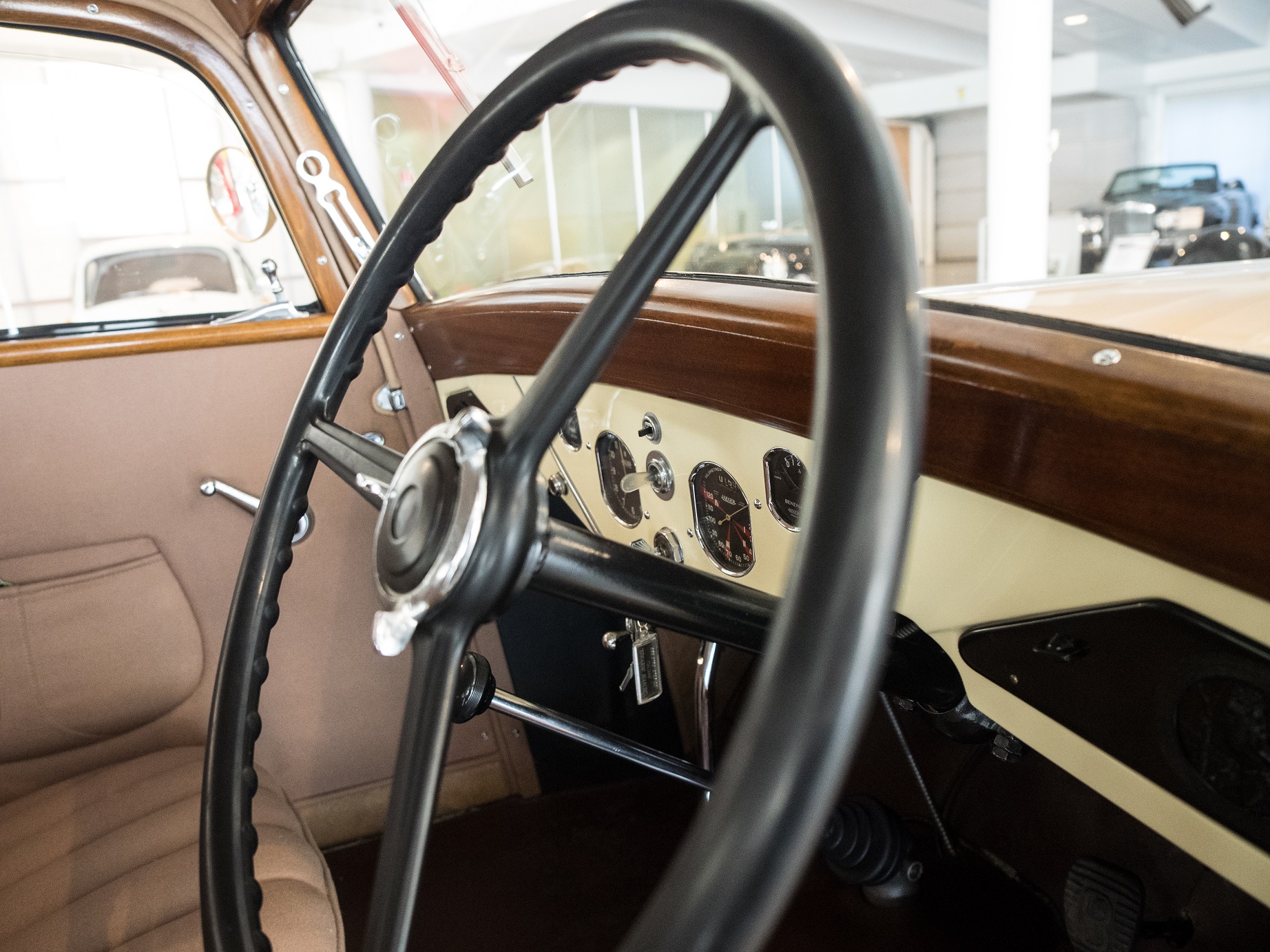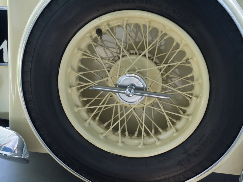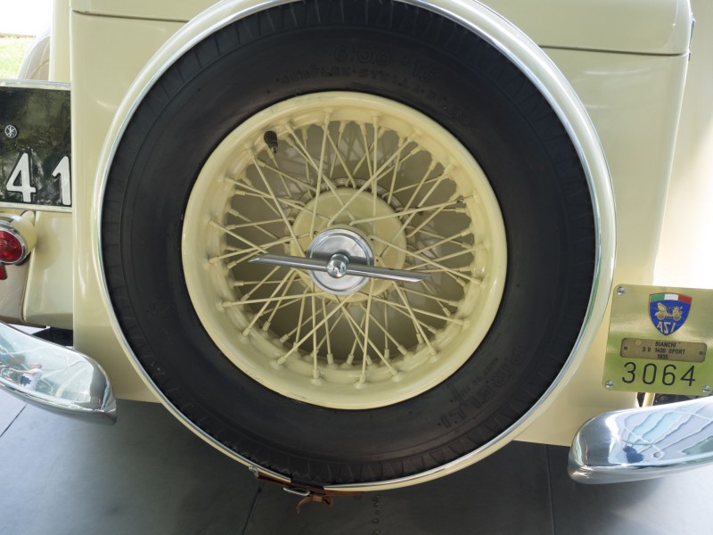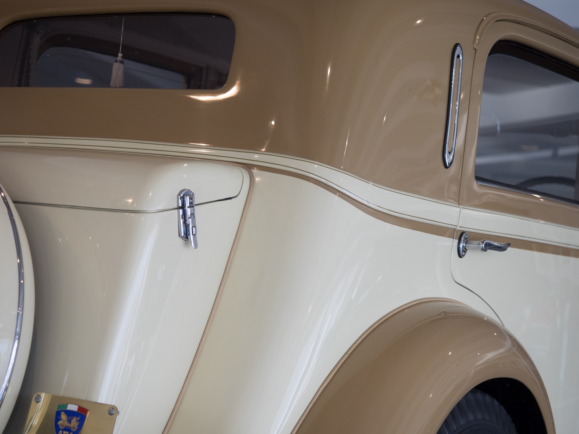 The streamlined body was offered with different bodies: sedan, coupe, and cabriolet version and a wide range of colours was offered as well. Among the characteristics of the car shown in the Museum there are the rear-hinged front doors, the typical “flag indicators” in the rear and tangent-spoked wheels. Near the driver’s seat, there is a crystal vase, where every morning fresh flowers were put and gave a pleasant fragrance to the interior.