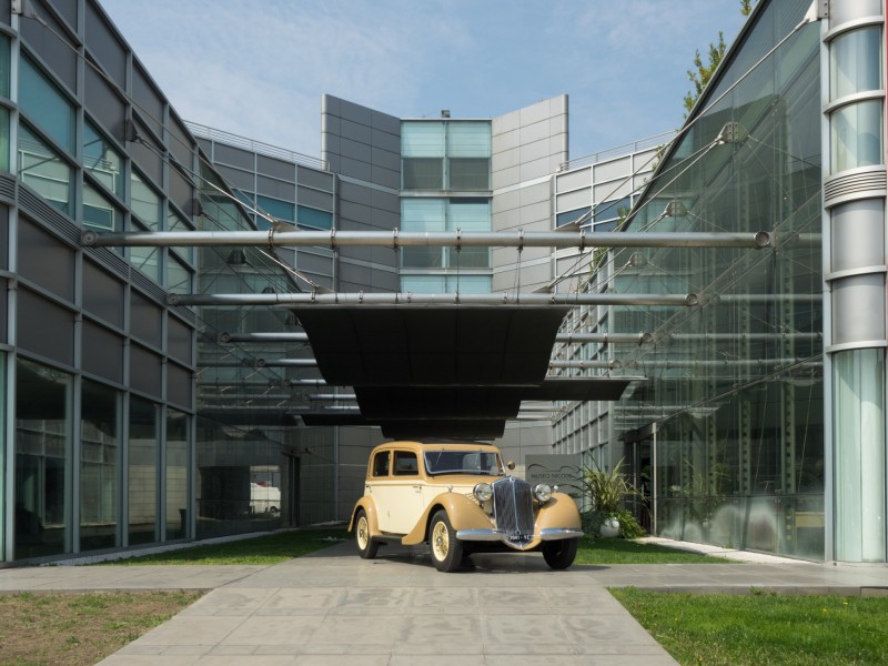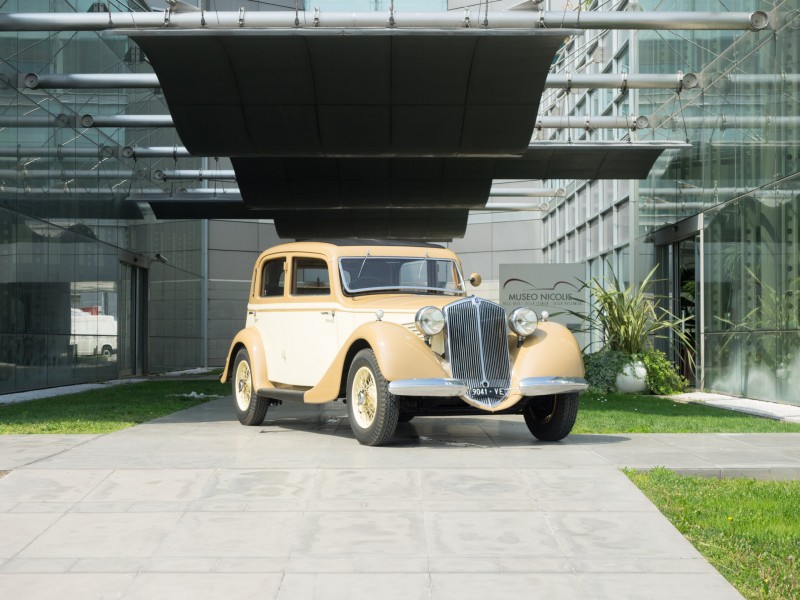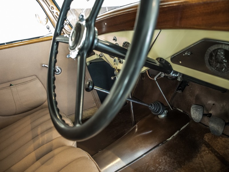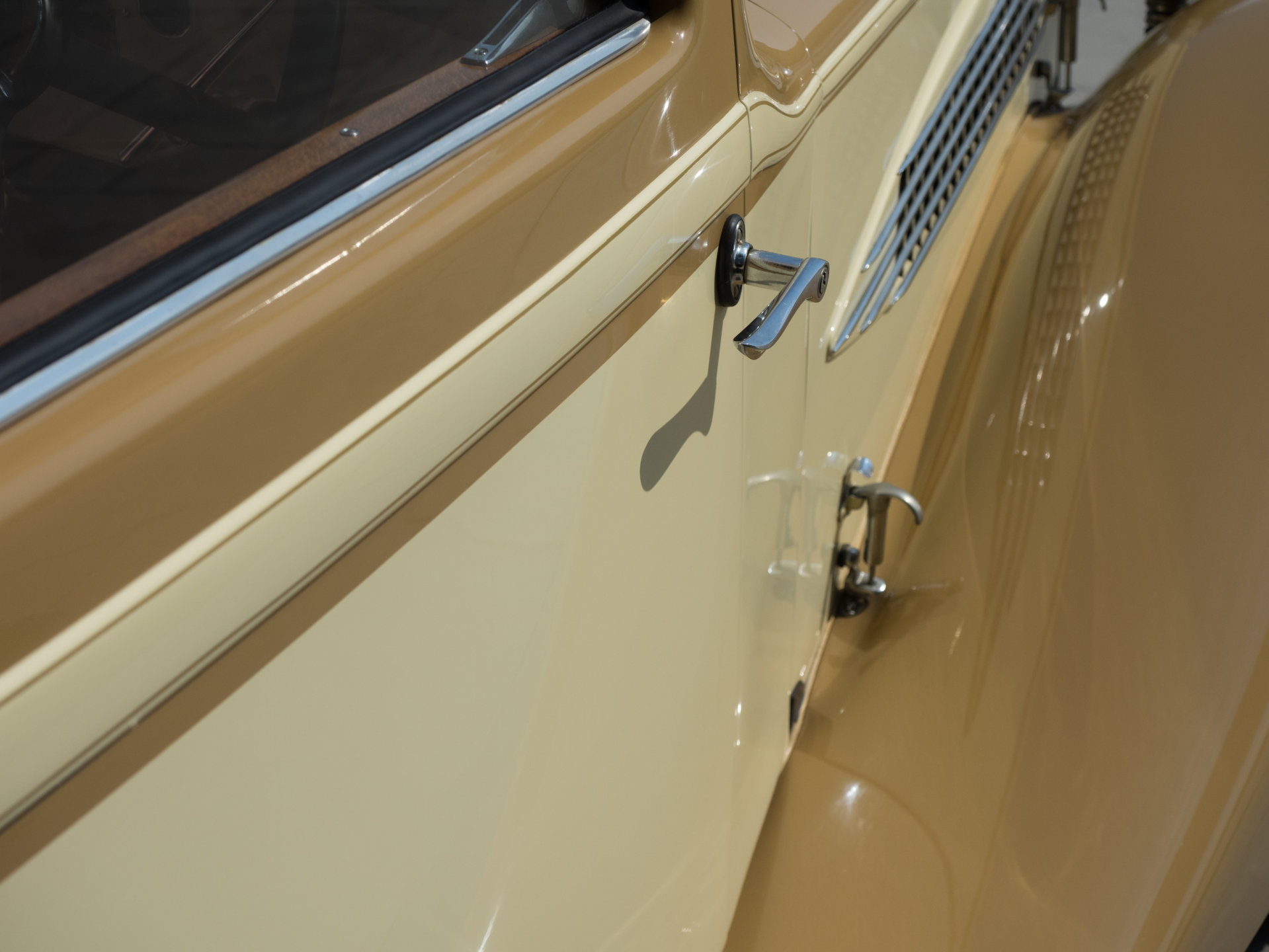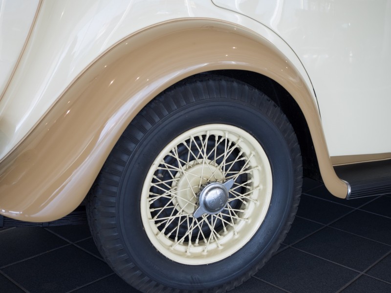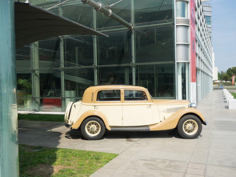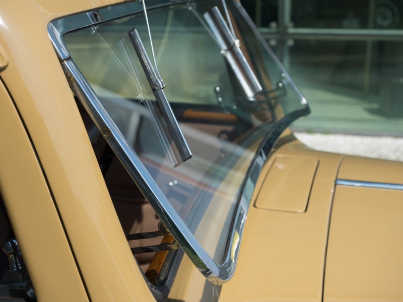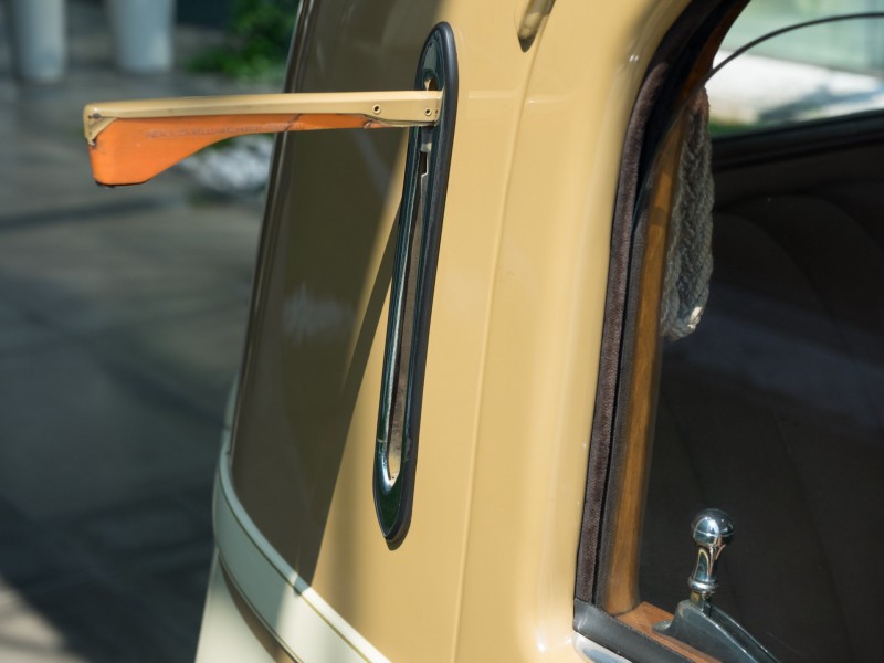 The streamlined body was offered with different bodies: sedan, coupe, and cabriolet version and a wide range of colours was offered as well. Among the characteristics of the car shown in the Museum there are the rear-hinged front doors, the typical “flag indicators” in the rear and tangent-spoked wheels. Near the driver’s seat, there is a crystal vase, where every morning fresh flowers were put and gave a pleasant fragrance to the interior.