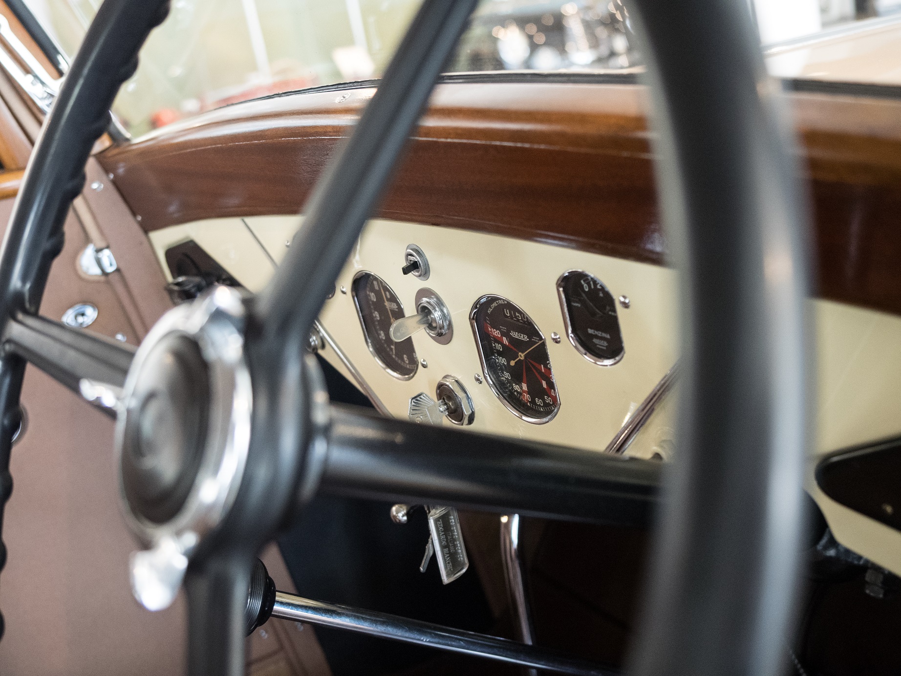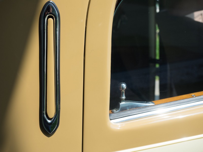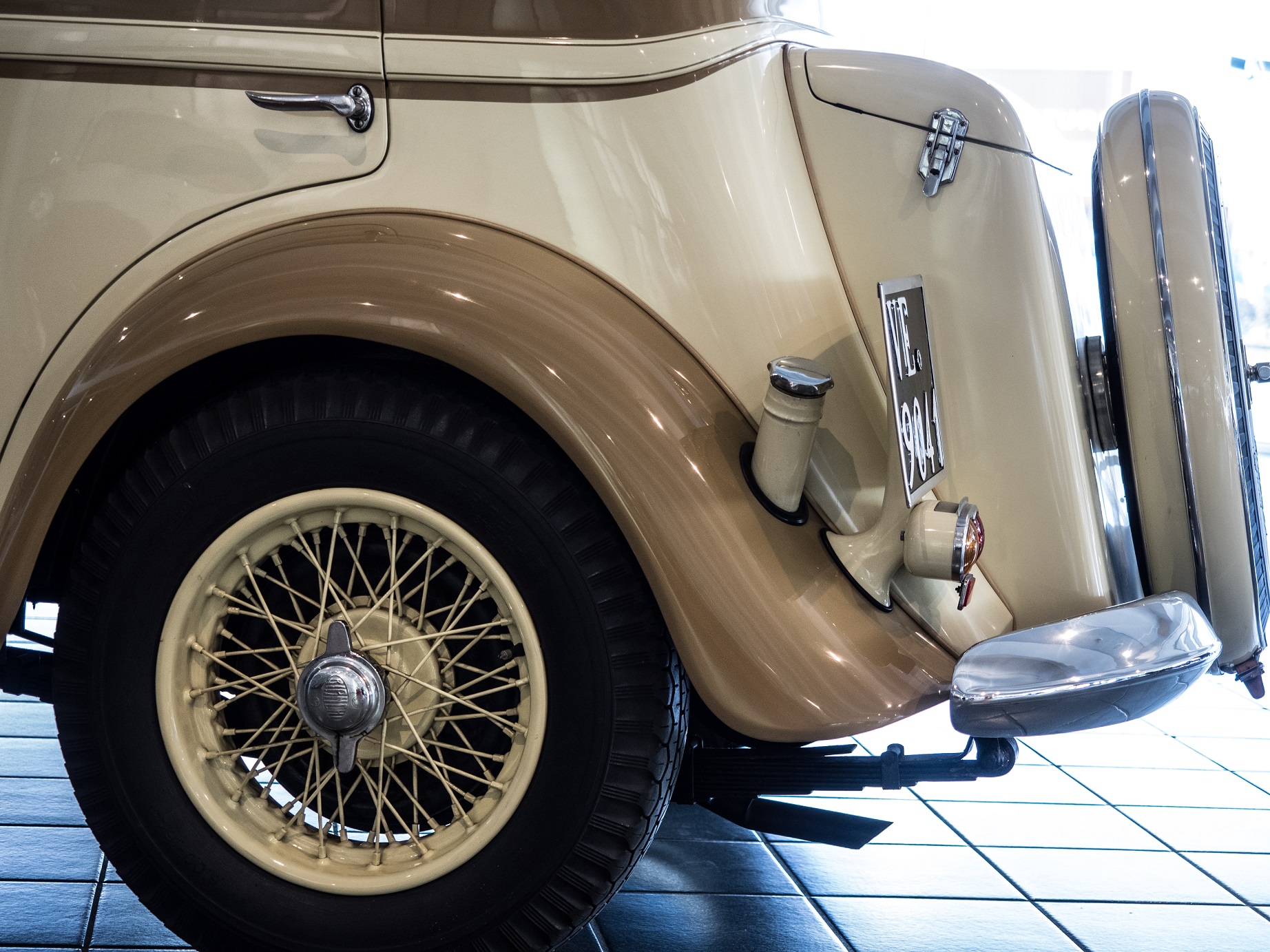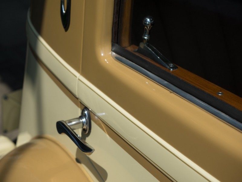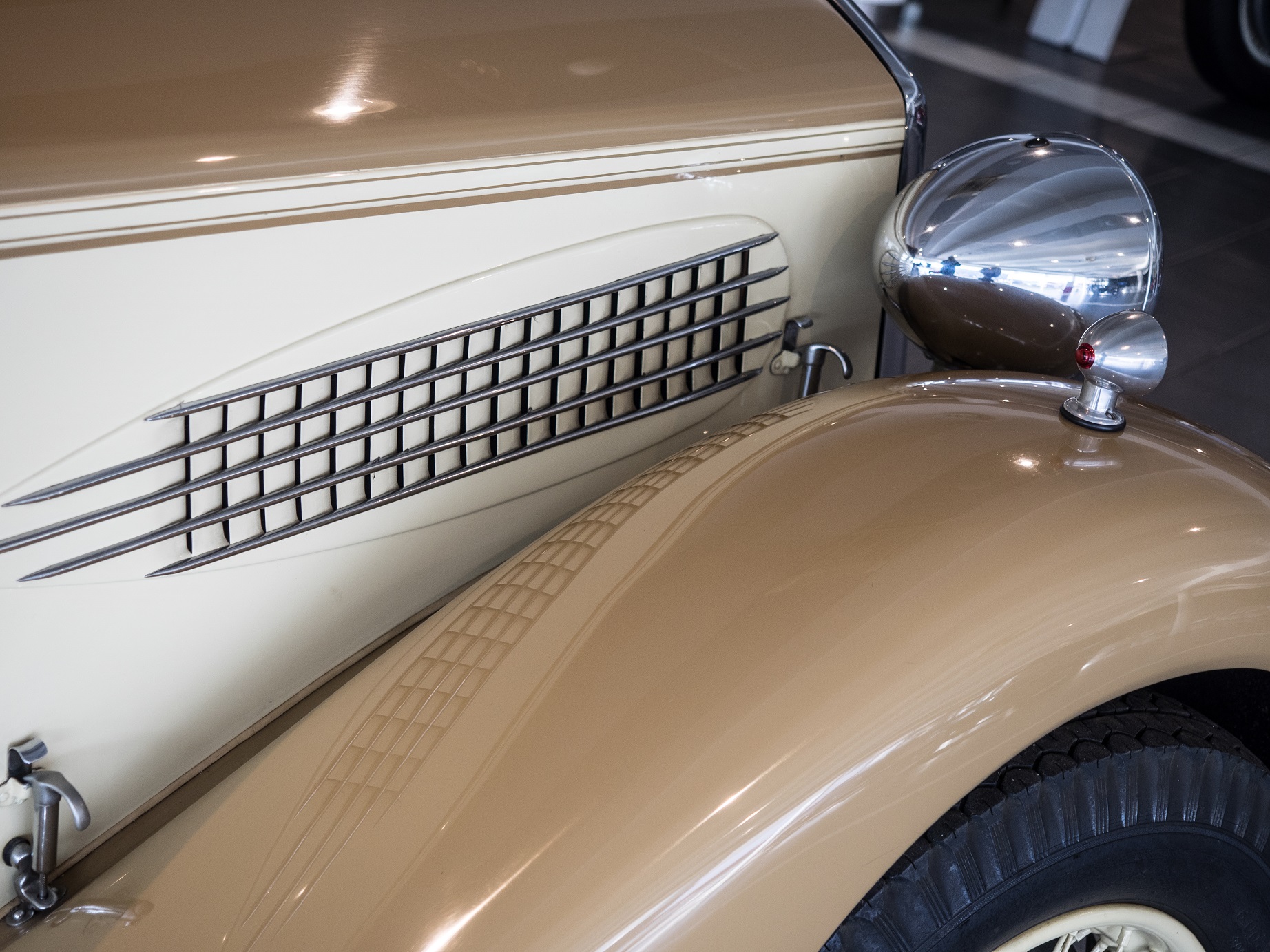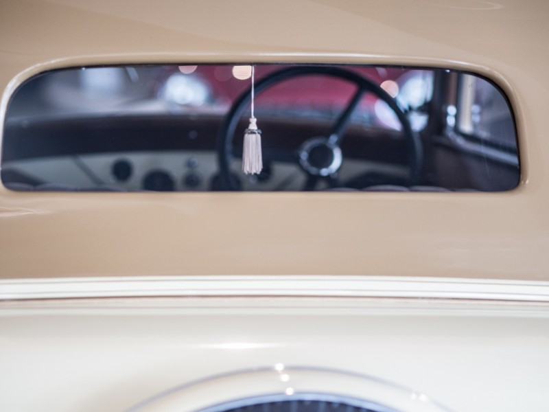 The streamlined body was offered with different bodies: sedan, coupe, and cabriolet version and a wide range of colours was offered as well. Among the characteristics of the car shown in the Museum there are the rear-hinged front doors, the typical “flag indicators” in the rear and tangent-spoked wheels. Near the driver’s seat, there is a crystal vase, where every morning fresh flowers were put and gave a pleasant fragrance to the interior.