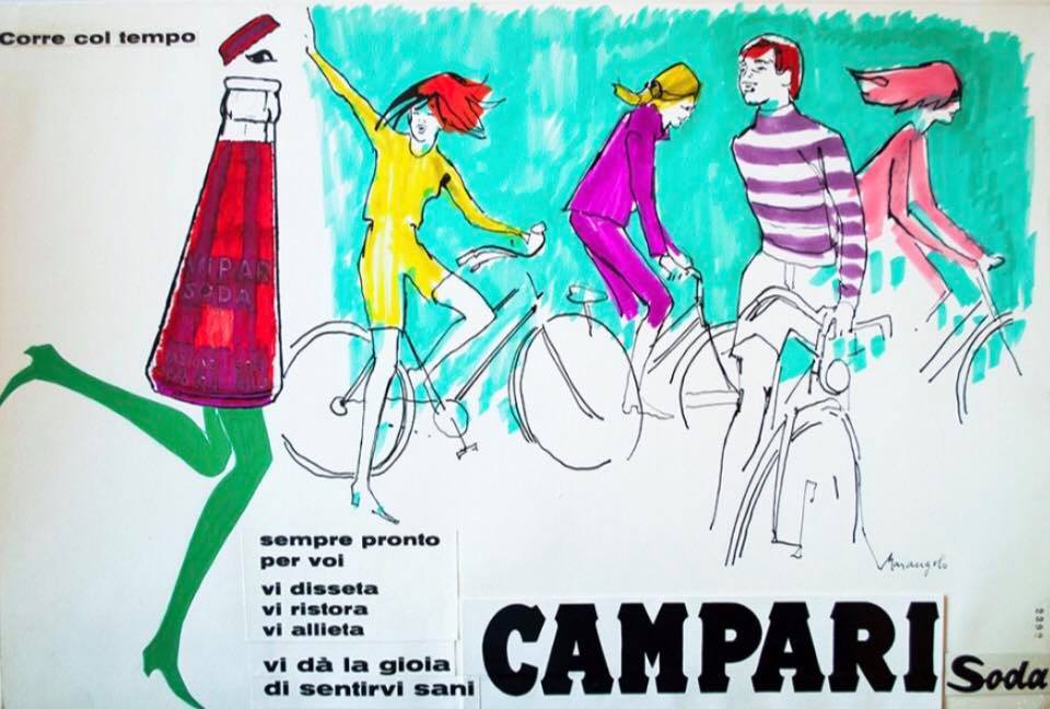 *Franz Marangolo (Milano, 1912 – 1995) Noto illustratore milanese. Negli anni Sessanta realizza per Campari innumerevoli bozzetti pubblicitari, dai tratti morbidi e leggeri, trasferendo su carta lo stile giocoso e libero di quel decennio, tutto all’insegna della joie de vivre.