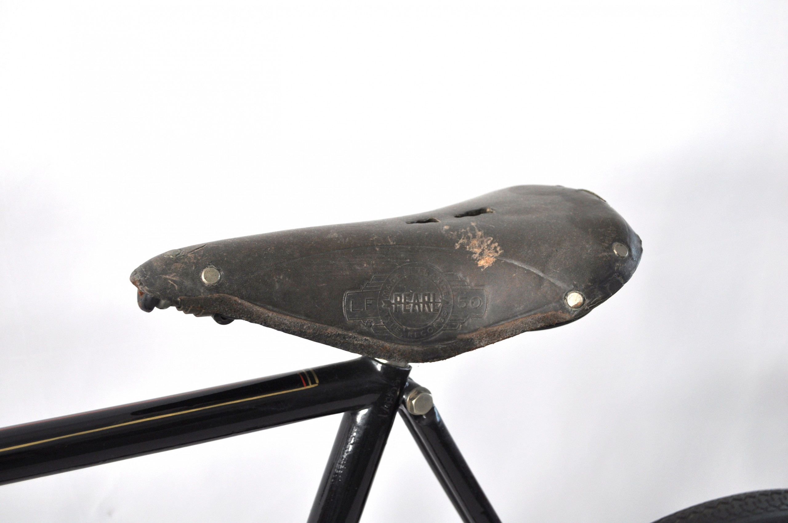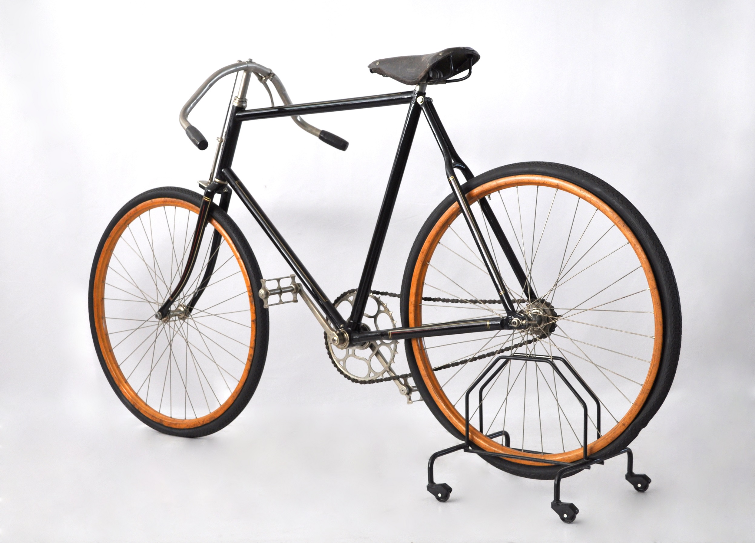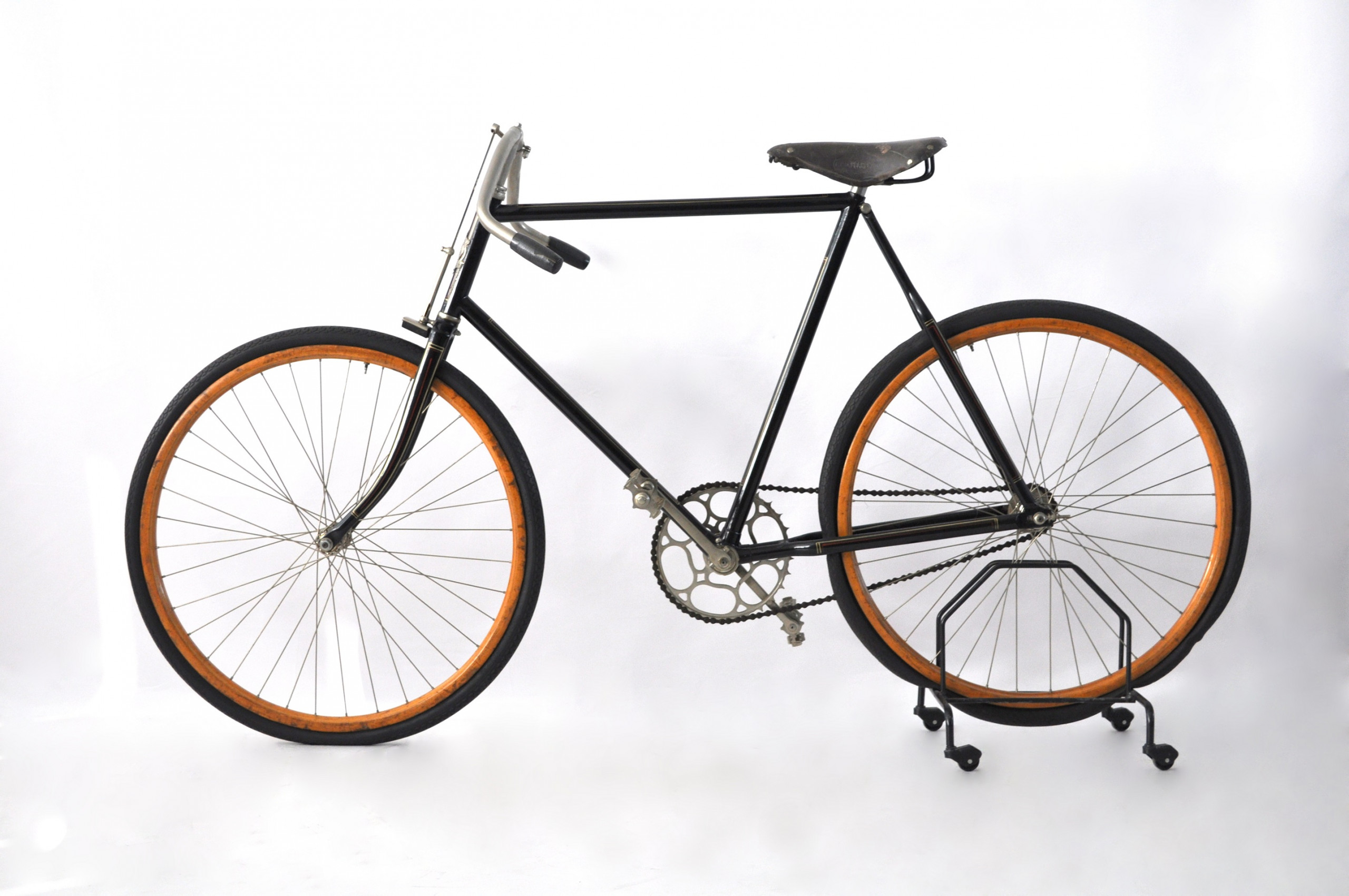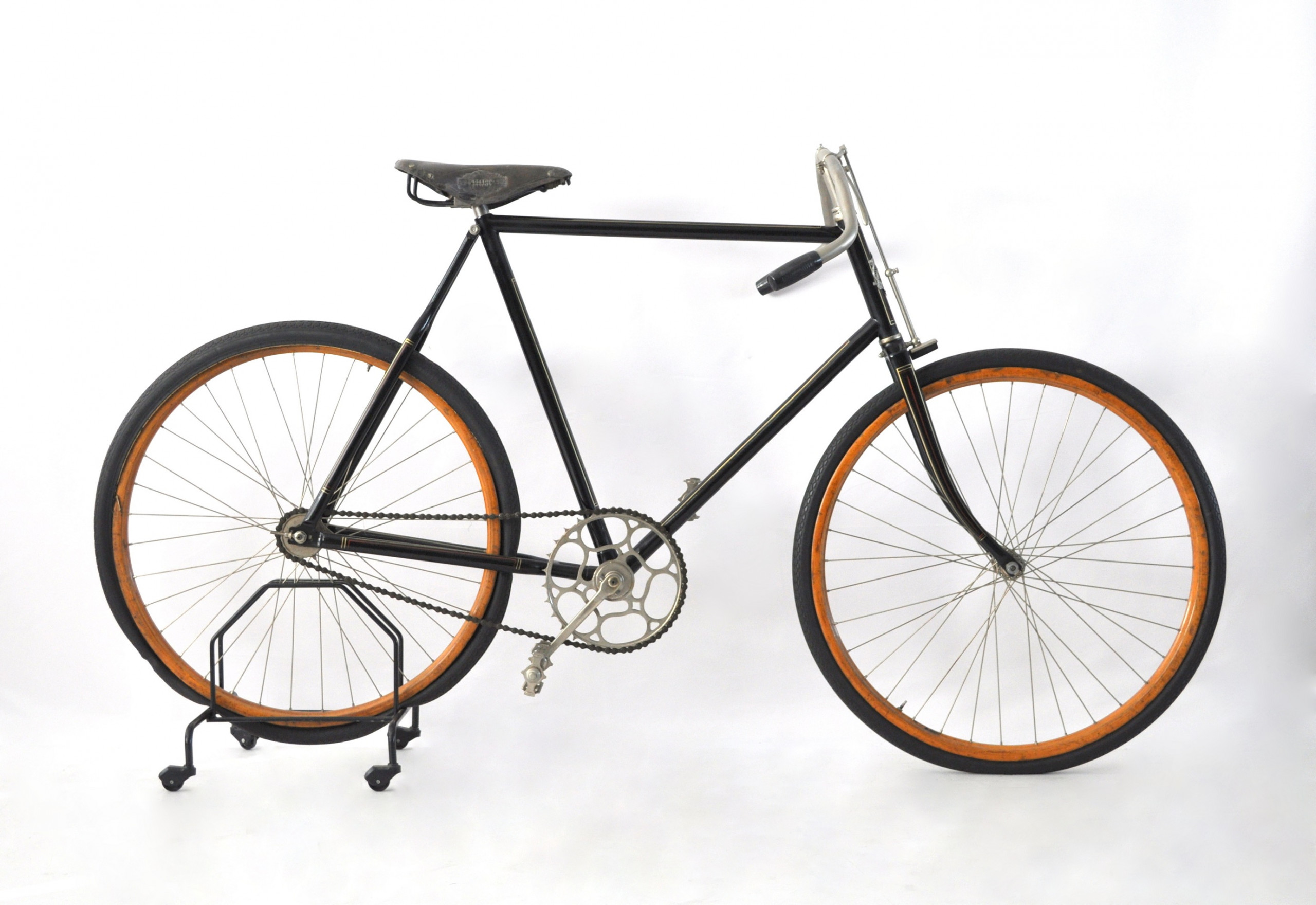 Racing bicycle with a flat-circuit chain ring, black frame with red and golden finish. This bicycle was made by the big company in Valentigney, that had already been making steam vehicles for more than 10 years. It was also among the first companies that started producing vehicles with internal combustion engines. The first gasoline car registered in Italy was a Peugeot. The owner was a man called Rossi from Vicenza, owner of the “Lanerossi” yarn industries.