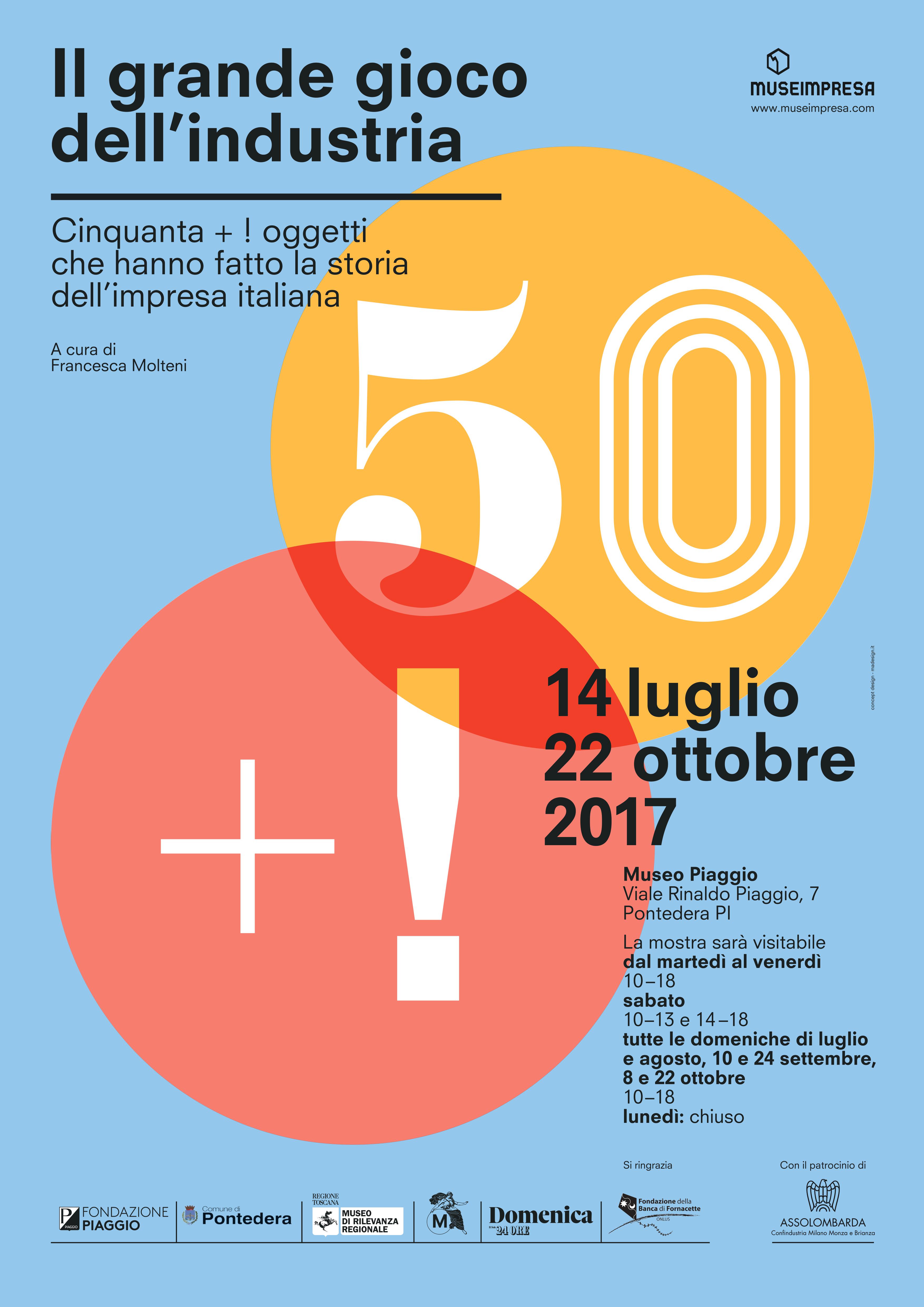 Per l’occasione la mostra, curata da Francesca Molteni, si rinnova e si arricchisce con nuove e sorprendenti storie. Questo racconto formidabile, che traccia le connessioni tra arte, design e società all’interno della cultura d’impresa italiana, sarà ospitato al Museo Piaggio fino al 22 ottobre 2017.