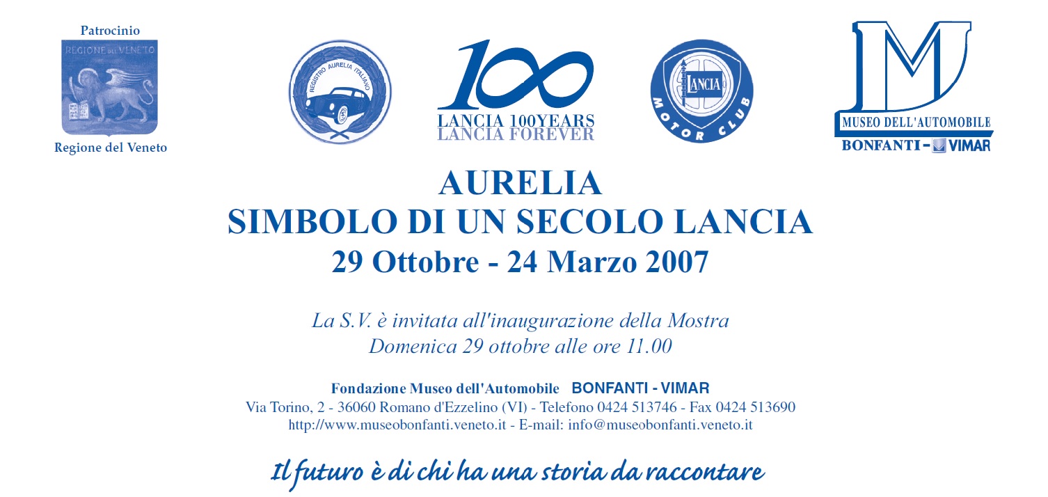 “Nell’ambito dei festeggiamenti dei 100 anni della Lancia, il Museo dell’Automobile “Bonfanti-VIMAR”, con la collaborazione del Registro Aurelia Italiano, del Museo Nicolis e di numerosi collezionisti privati italiani ed esteri, proporrà dal 28 ottobre 2006 al 24 marzo 2007 una rassegna sul tema “Aurelia, simbolo di un secolo Lancia”.