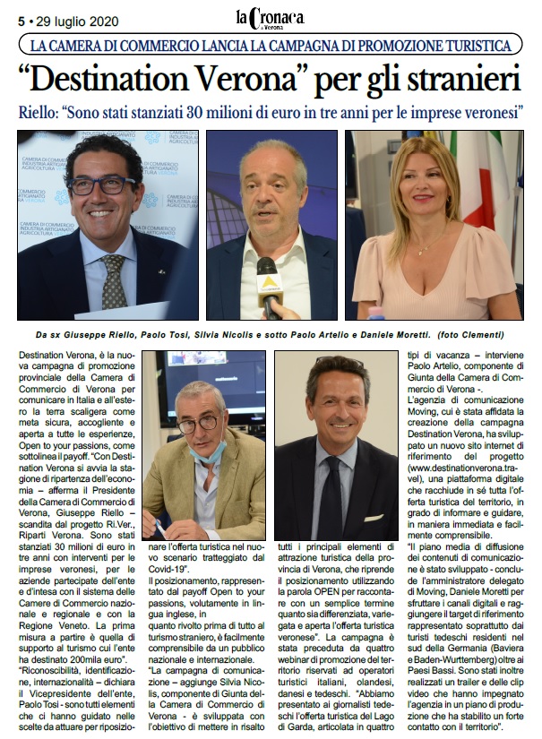 La Camera di Commercio lancia la campagna di promozione della destinazione turistica Verona, "Destination Verona", per attirare nuovamente i flussi dall’estero.