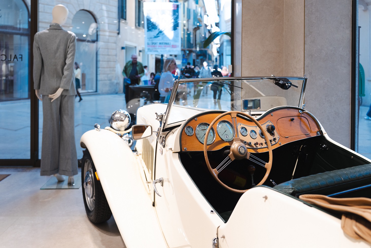 Al centro della scena, una vettura d'epoca del Museo Nicolis che incarna perfettamente questo dialogo tra stile e tempo: la MG TD Midget del 1951. Un’icona dello stile anglosassone, espressione autentica dello spirito dei gentleman driver, dove la guida diventa gesto elegante, esperienza raffinata, piacere puro. Il modello MG T-Type, con telaio separato, fu prodotto dalla Morris Garages dal 1936 al 1955 in diversi modelli. La TD, dal 1950, è la continuazione della serie di piccole vetture sportive e, in particolare, l'esemplare del Museo Nicolis presenta il cruscotto in legno lavorato a mano.