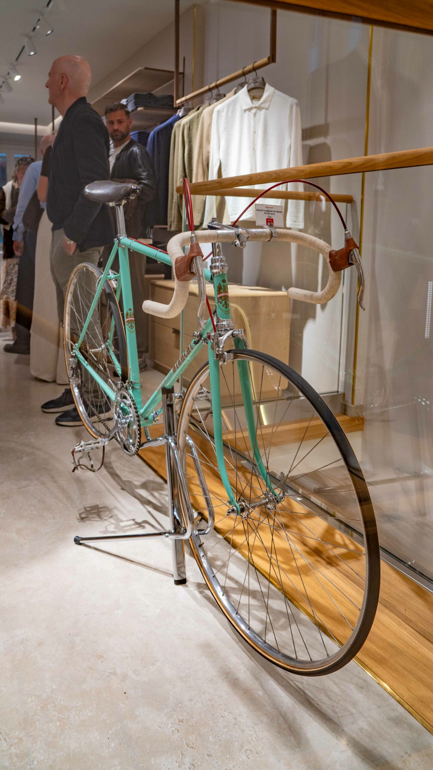 Accanto a lei, la Bianchi “Campione del Mondo” del 1953, una bicicletta che porta con sé il mito del grande ciclismo italiano. Con modelli di questa generazione, Fausto Coppi conquistò il Campionato del Mondo a Lugano, riportando l’Italia al vertice dopo oltre vent’anni. Questo modello del Museo Nicolis è un esemplare della prima serie con deragliatore centrale a leva.