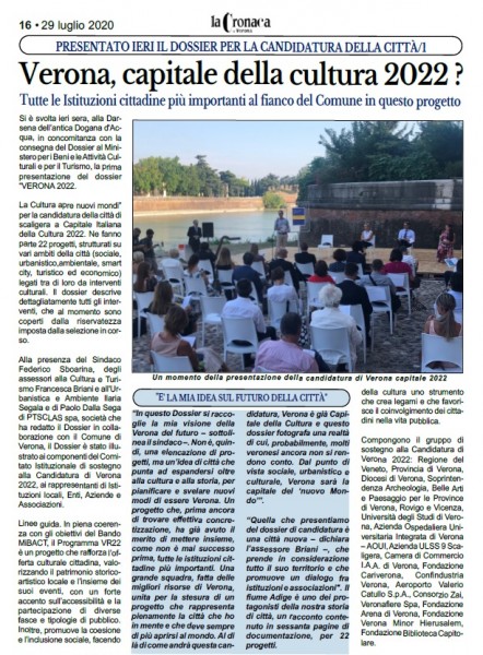 «In questo Dossier si raccoglie la mia visione della Verona del futuro, non è, quindi, un elenco di progetti, ma un’idea di città che punta ad espandersi oltre alla cultura e alla storia, per pianificare e svelare nuovi modi di essere Verona» continua Sboarina. «Verona sta dando così una propria visione del futuro, che unisca il valore della cultura allo sviluppo urbanistico. Al di là di come andrà questa candidatura, Verona è già Capitale della Cultura e questo dossier fotografa una realtà di cui, probabilmente, molti veronesi ancora non si rendono conto».