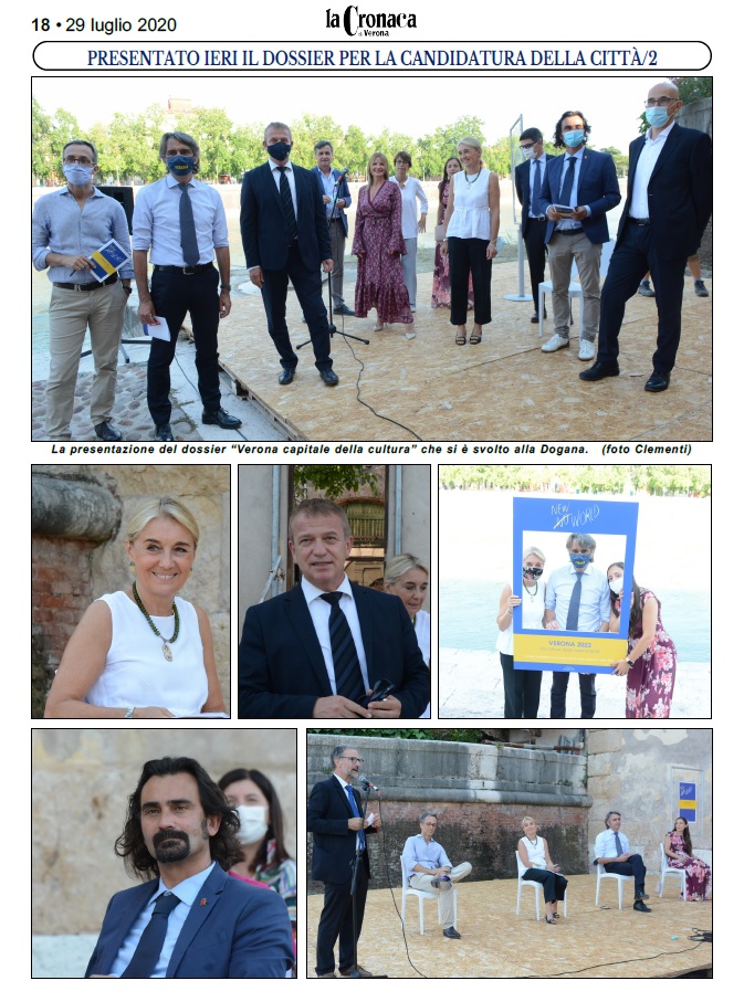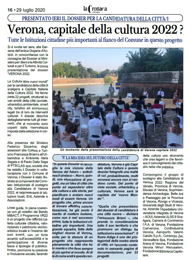 La candidatura di Verona a Capitale Italiana della Cultura 2022 è ufficiale. Alla presenza ieri sera del numeroso comitato istituzionale alla Darsena dell’antica Dogana d’Acqua, il sindaco Federico Sboarina, gli assessori alla Cultura e Turismo Francesca Briani e all’Urbanistica e Ambiente Ilaria Segala e Paolo Dalla Sega di PTSCLAS spa, società che ha redatto il Dossier in collaborazione con il Comune di Verona, hanno presentato il Dossier “Verona 2022. La Cultura apre nuovi mondi”.