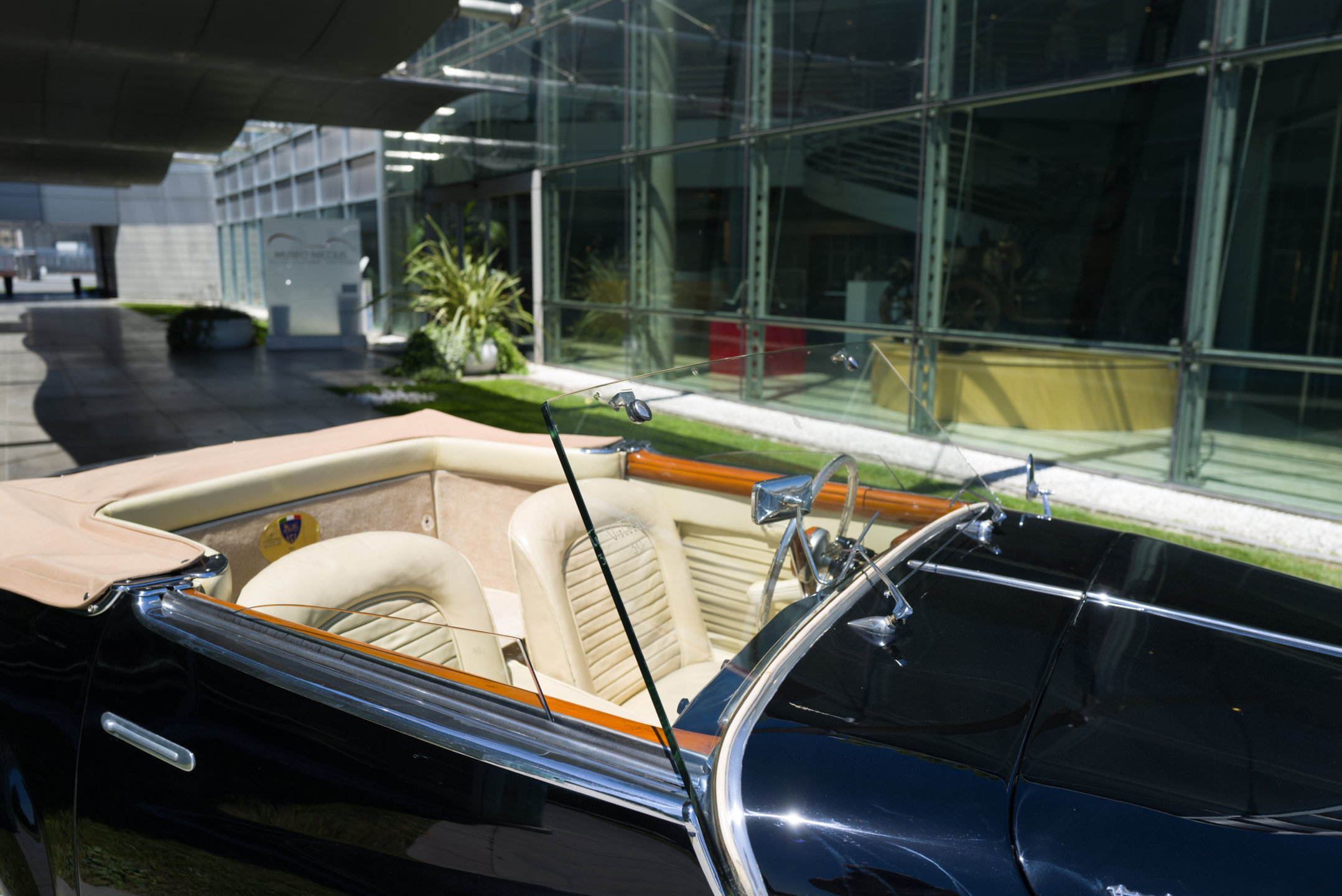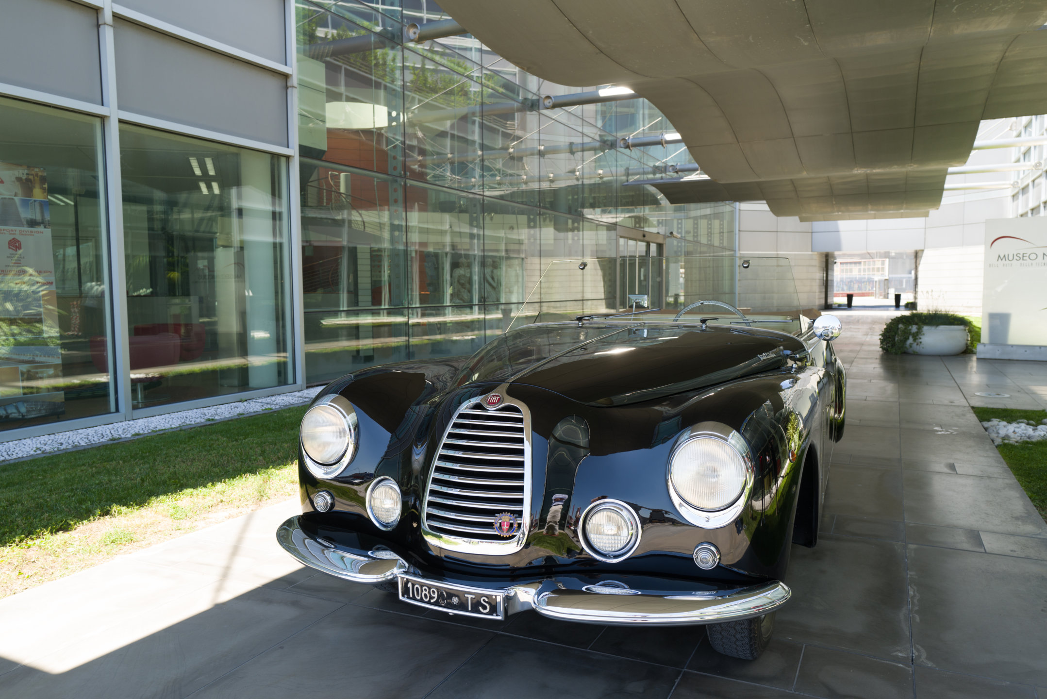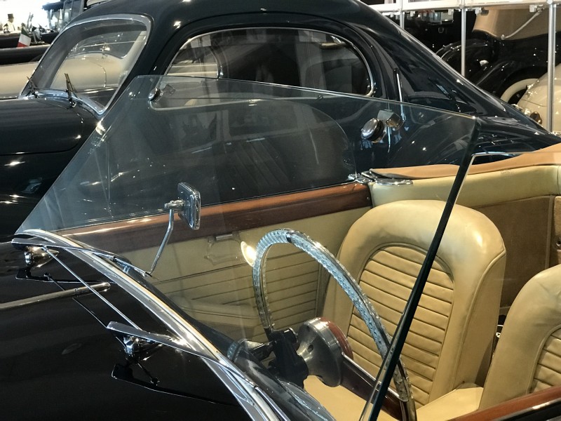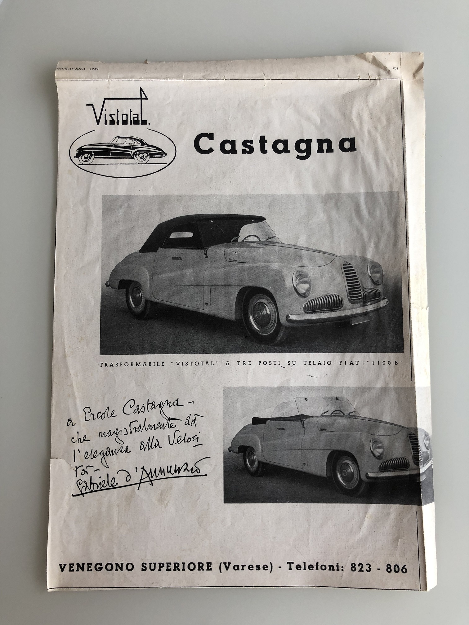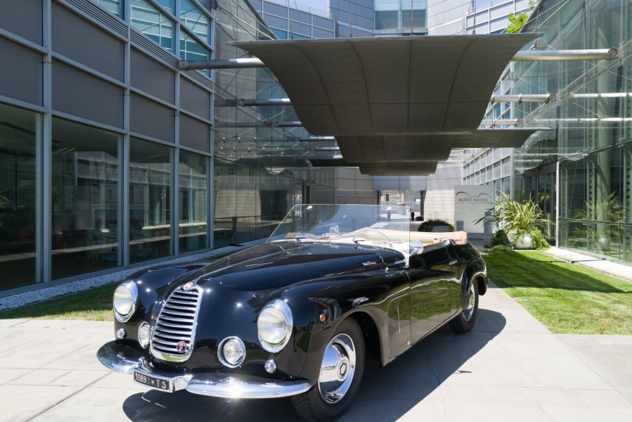 La vettura esposta è un esemplare molto raro realizzato dalla Carrozzeria Castagna di Milano che negli anni a cavallo fra le due guerre si era imposta in tutto il mondo con le sue eleganti carrozzerie costruite su telai prestigiosi, come quella che veste l’Isotta Fraschini Tipo 8AS del Museo Nicolis. Il cabriolet “Vistotal” deve il suo nome al particolare parabrezza senza montanti, che permette una visibilità totale della strada attraverso l'impiego di vetro temperato di largo spessore che è parte integrante della struttura. Sperimentato dal carrozziere parigino Jean Henri-Labourdette nel 1935, fu denominato "Vutotal" quale sincrasi di "vue totale". Questa raffinata Fiat 1100 è una delle ultime creazioni della carrozzeria Castagna e si distingue per la ricercatezza dei suoi dettagli. In sintonia con il parabrezza è anche il volante trasparente, un’opera d’arte vista solo su vetture di maggiore importanza. La Vistotal del Nicolis circola ancora con il suo Libretto originale e risulta essere passata tra le mani dello stesso Ercole Castagna. Nel nostro centro documentazione è conservata una pubblicità dell’epoca (rivista Motor Italia del 1949) con dedica di Gabriele D’Annunzio “A Ercole Castagna che magnificamente dà eleganza alla Velocità”.