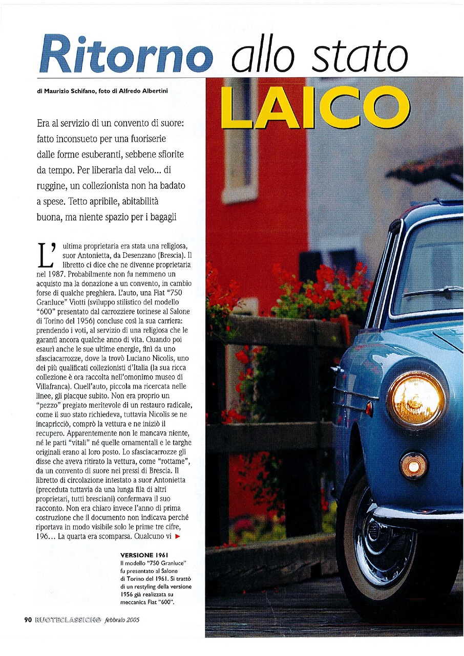 Una storia affascinante: dal convento al restauro - "La vettura del museo era al servizio di un convento di suore: fatto inconsueto per una fuoriserie dalle forme esuberanti, sebbene sfiorite da tempo. Per liberarla dal velo... di ruggine, un collezionista non ha badato a spese. Tetto apribile, abilità buona, ma niente spazio per i bagagli. L'ultima proprietaria era stata una religiosa, suor Antonietta. Probabilmente non fu nemmeno un acquisto ma la donazione a un convento, in cambio forse di qualche preghiera... Quando poi esaurì anche le sue ultime energie, finì da uno sfasciacarrozze, dove la trovò Luciano Nicolis". Un destino insolito per un’auto dalle linee eleganti e dal carattere esuberante, che oggi rivive grazie alla passione e all’impegno del Museo Nicolis.